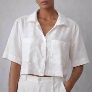 Lans Relaxed Alba Off White Washed Linen Woman Pocket Crop Top ( XS to 4XL )