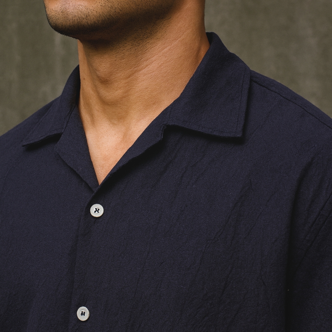 This shirt follows classic shirt architecture — but with elevated details. The crisp point collar frames the neckline neatly, the button-down front gives versatility, and the reinforced seams ensure long-lasting wear. The navy tone adds a mature, polished character, making it suitable for both casual and semi-formal styling.