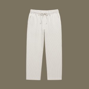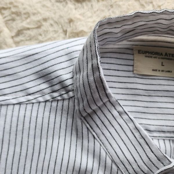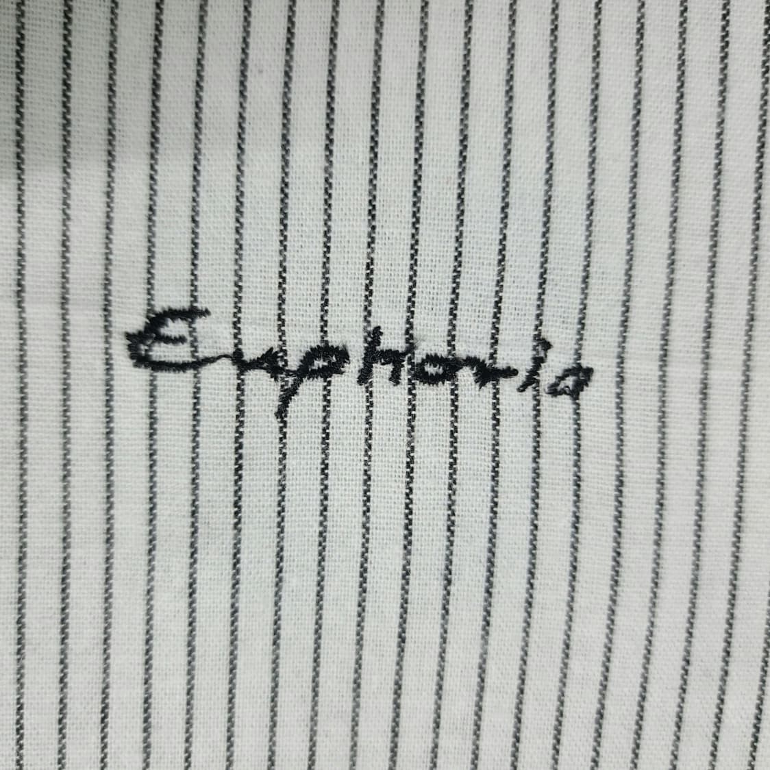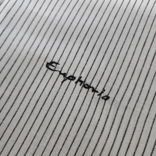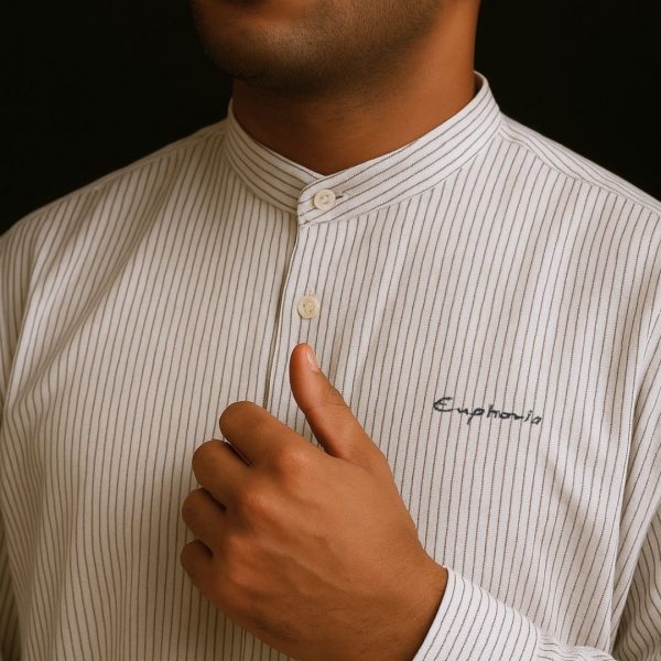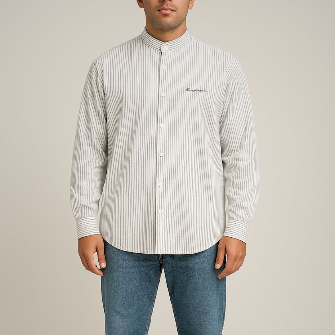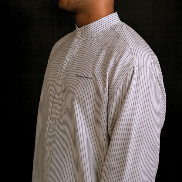 This shirt softens the precision of pinstripes with an airy oversized cut and elevates it further with Euphoria embroidery—a subtle artistic signature that adds depth and individuality. The band collar keeps the neckline open and breathable—perfect for warm climates, casual office days, or travel.