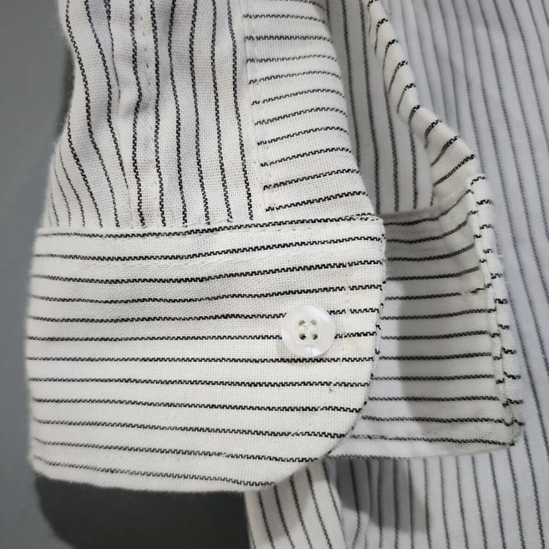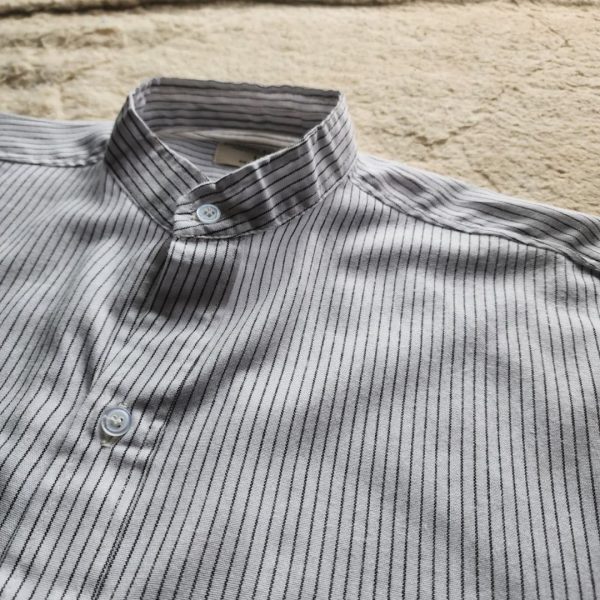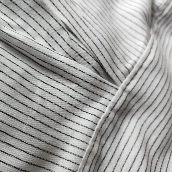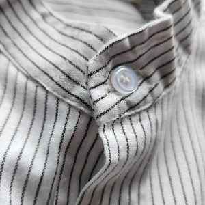 Evenly spaced black pinstripes add subtle depth to the white base fabric. Horizontal placement on the collar and cuffs gives a refined contrast detail.