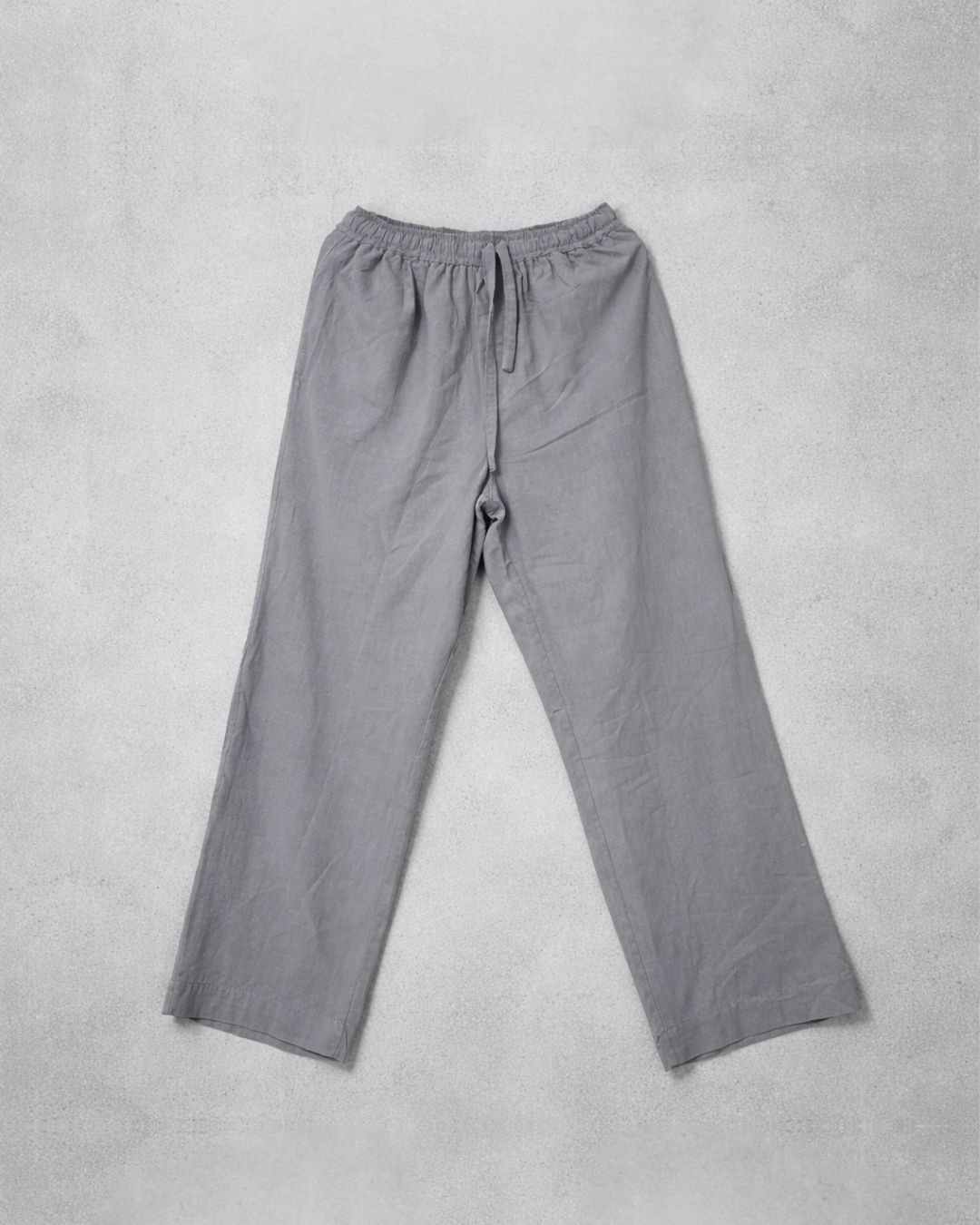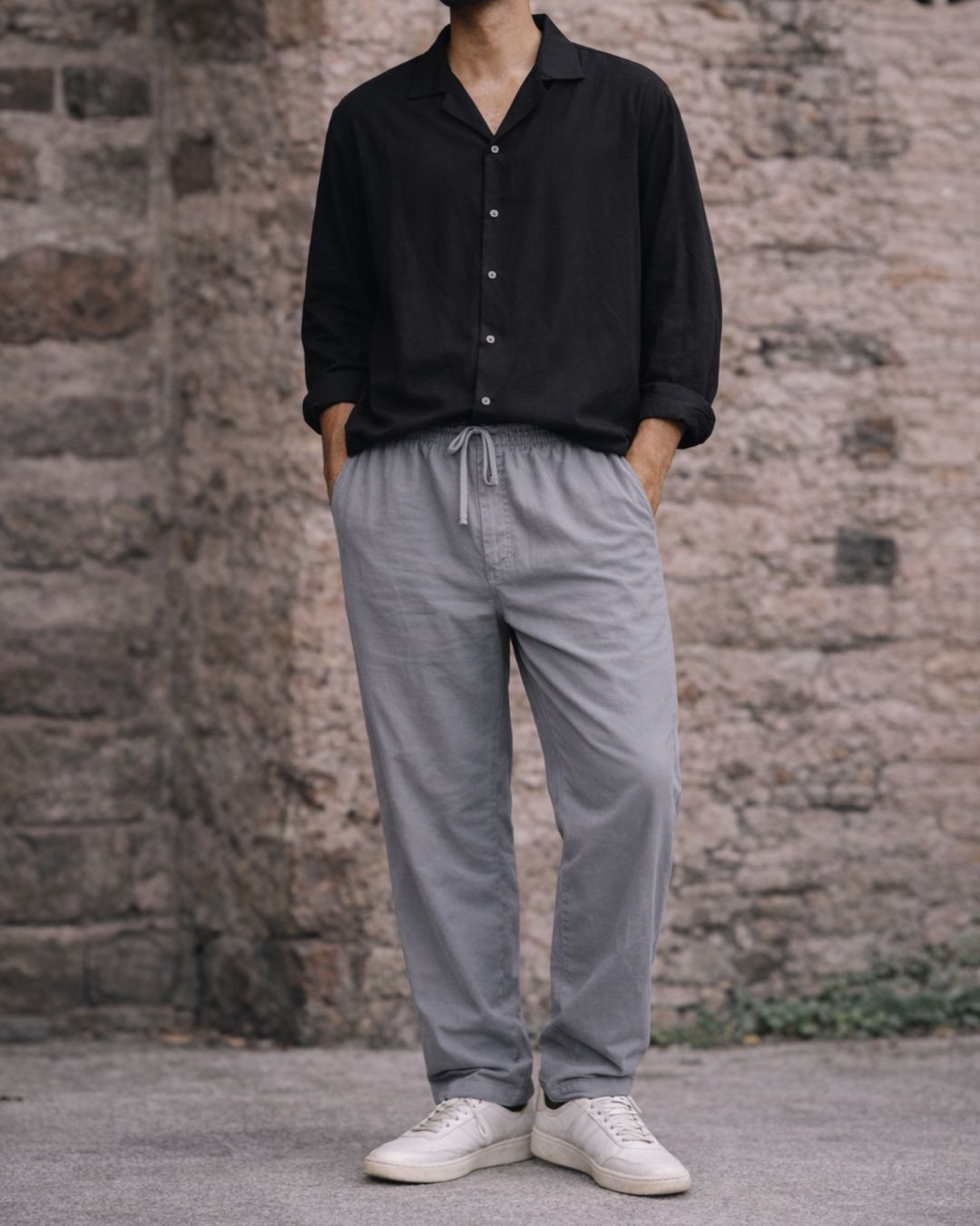 The grey long pant introduces contrast and balance to the set. Its relaxed fit ensures comfort, while the neutral tone complements the black shirts for a cohesive and modern look.
