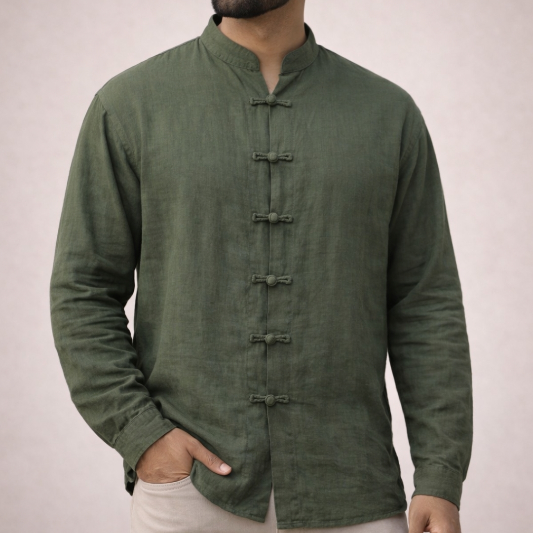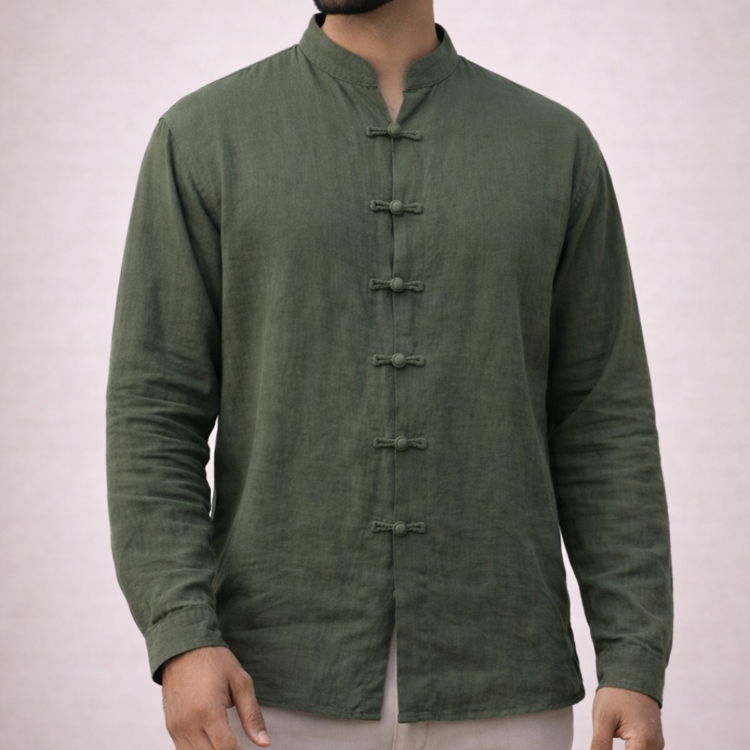 Lans Oversized Colonial Premium Loop down Mandarin Collar Shirt is a modern reimagining of timeless tailoring, defined by its distinctive loop closure and relaxed oversized cut. Crafted inan olive green cotton it brings together heritage detail and contemporary minimalism, offering a shirt that feels both elevated and effortless.