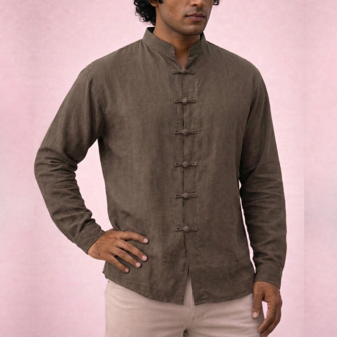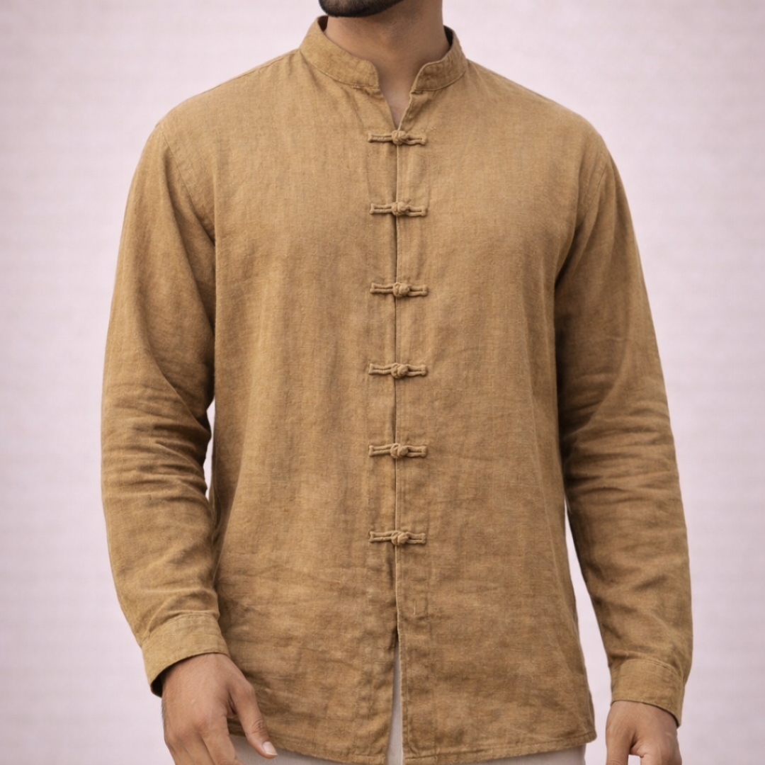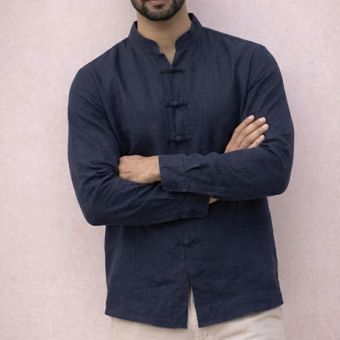 A row of artisanal fabric loops replaces traditional buttons, adding a heritage-inspired focal point that celebrates craftsmanship and subtle detailing.