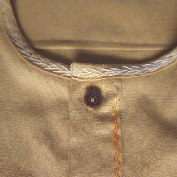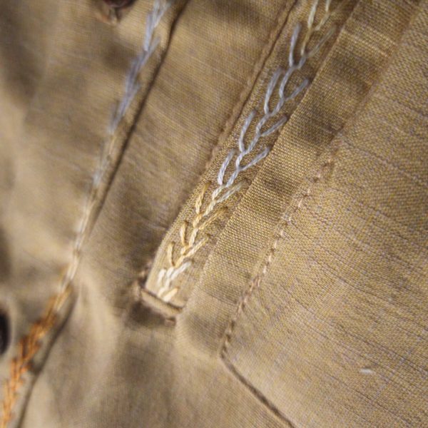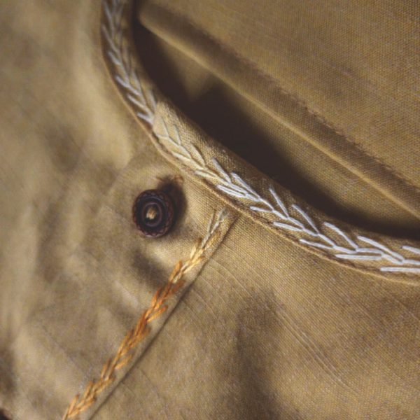 Artisanal Placket: Visible, uneven hand-sewn details — intentionally imperfect, celebrating craftsmanship