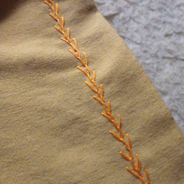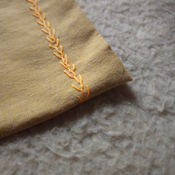 Hand-Stitched Finishing: Contrasting orange-brown thread along seams and hems, inspired by kantha-style running stitches