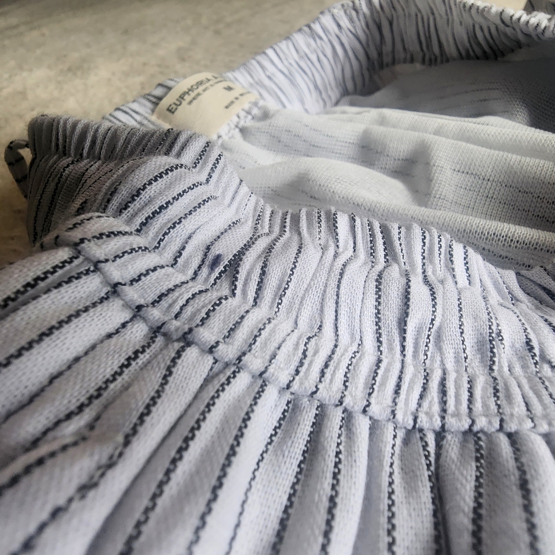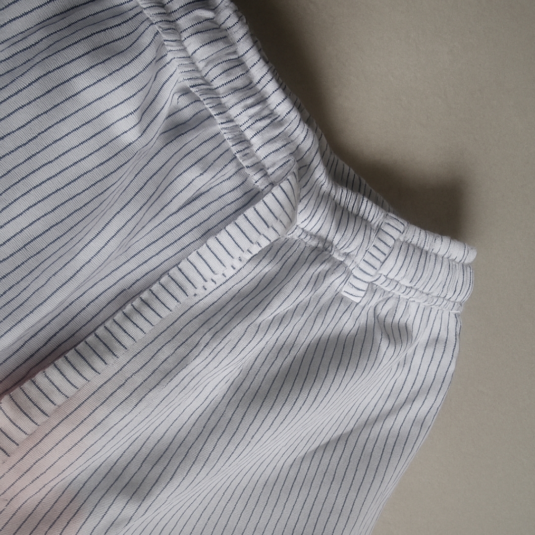The navy-and-white vertical stripes are precisely matched at the seams for a cohesive, tailored look. Even elastic gathering around the waistband ensures the stripes remain evenly spaced and the drape stays consistent.