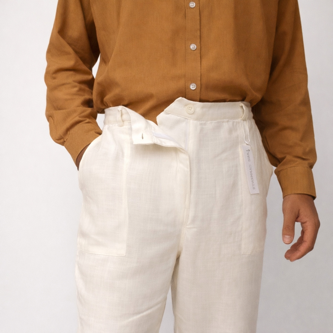 Crafted from breathable linen, chosen for its airy quality and natural texture. The fabric is lightweight yet substantial enough to support the oversized cut, allowing the pant to hold its shape while remaining comfortable in warm climates.