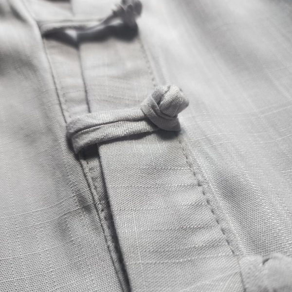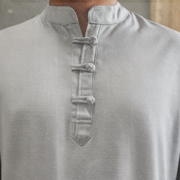 Placket: Signature three handcrafted fabric loops with knot closures, offering a distinct artisanal touch.