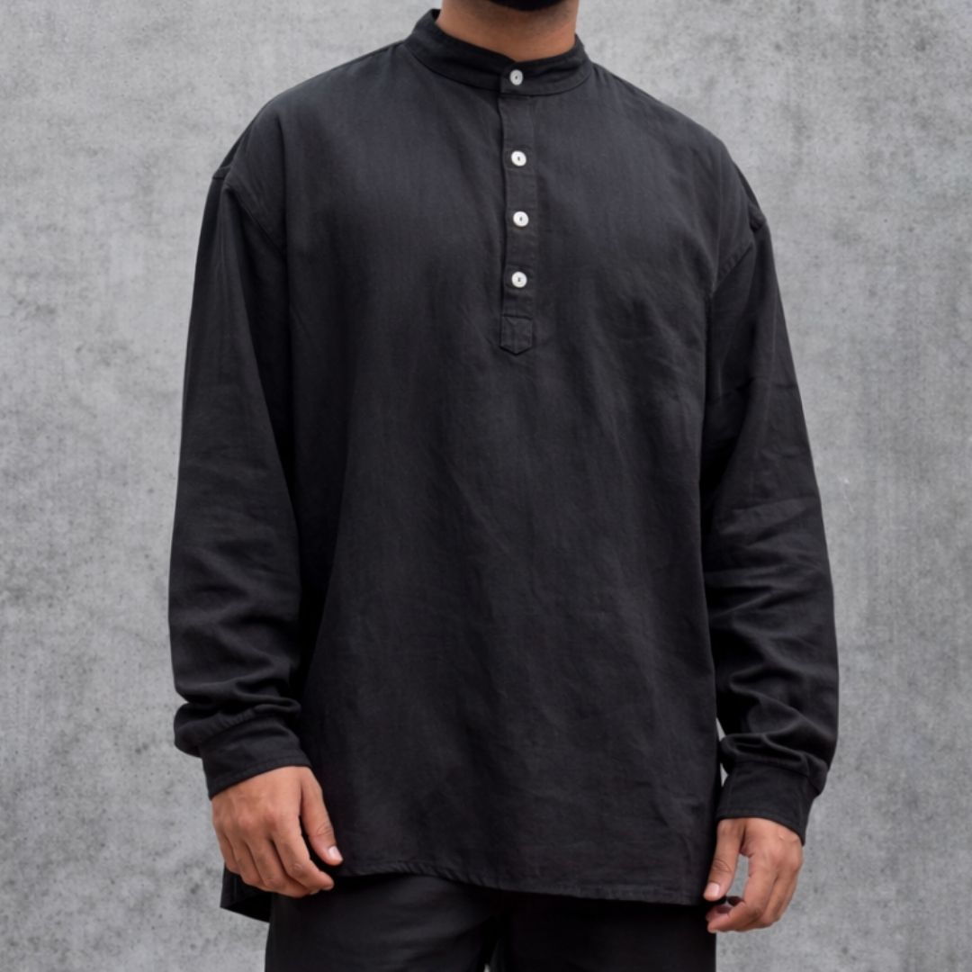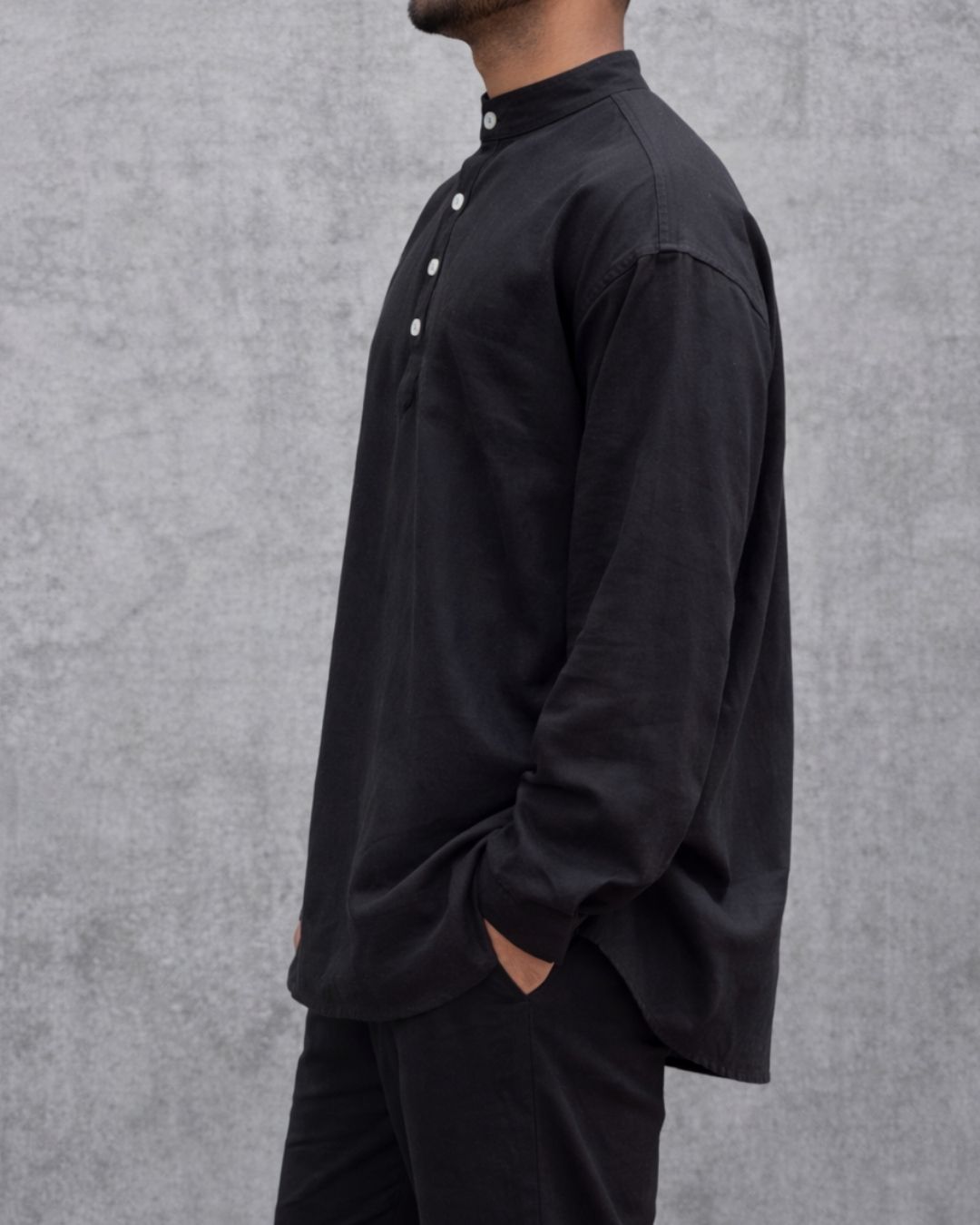The Lans Oversized Mandarin Resort Shirt – Black blends clean tailoring with relaxed proportions, creating a modern essential for everyday and resort wear. Designed with a mandarin collar, the shirt offers a minimal neckline that feels refined and contemporary.