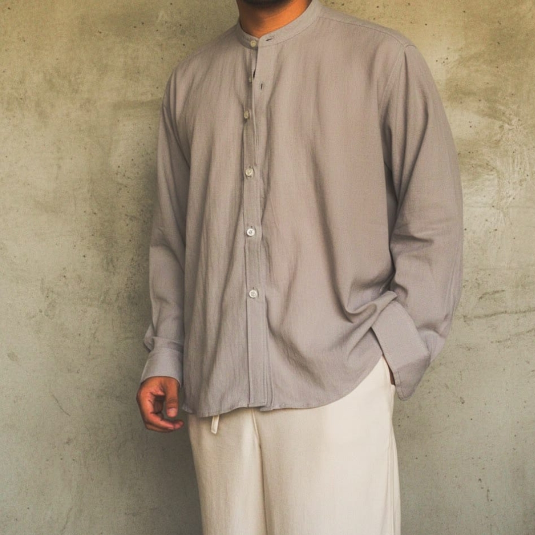 The Lans Oversized Washed Cotton Mandarin Shirt redefines casual sophistication through simplicity and texture.