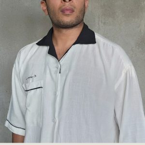 The signature contrast detailing is what defines the Monochrome Camp Shirt. A deep black Cuban-style camp collar sets a bold frame around the neckline, offering a timeless resort appeal. Clean black piping along the sleeves and pocket edge sharpens the design further, reinforcing its monochrome character without overpowering the look.