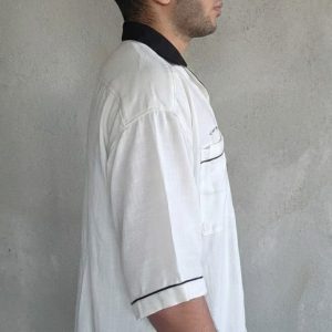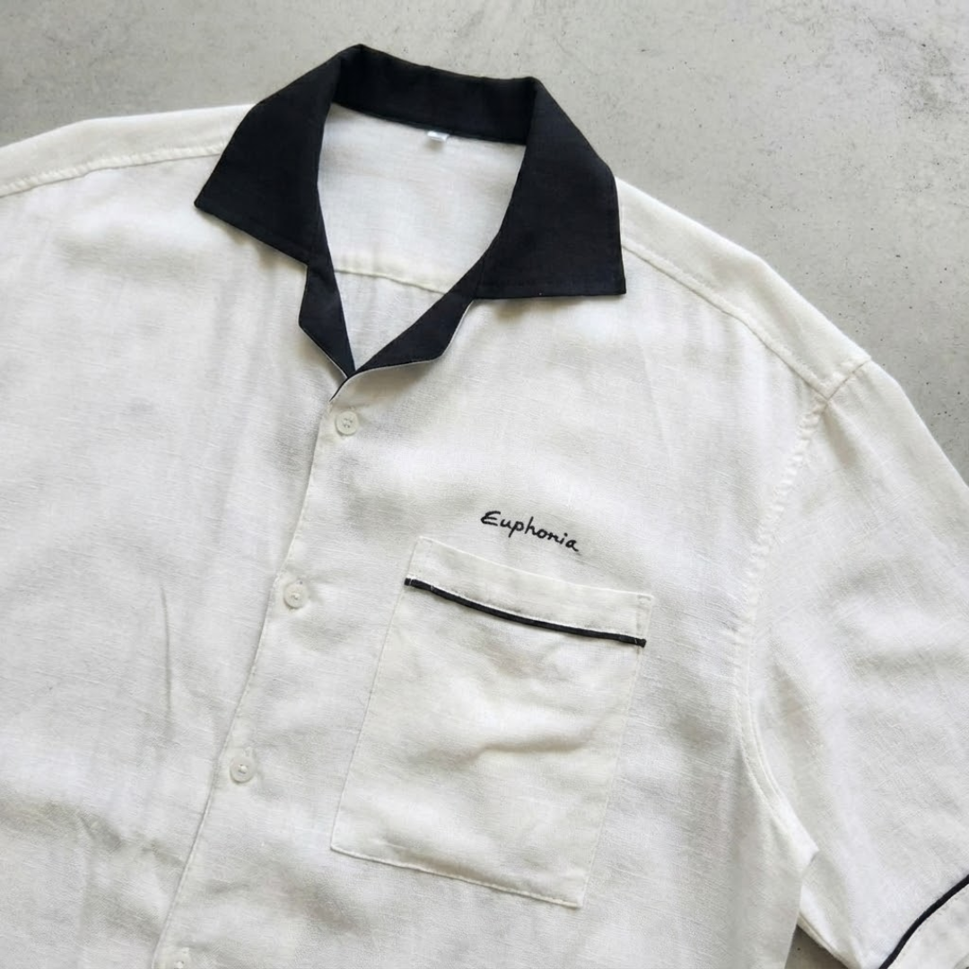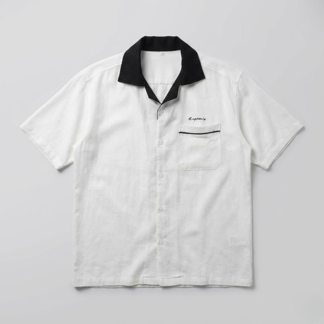 The signature contrast detailing is what defines the Monochrome Camp Shirt. A deep black Cuban-style camp collar sets a bold frame around the neckline, offering a timeless resort appeal. Clean black piping along the sleeves and pocket edge sharpens the design further, reinforcing its monochrome character without overpowering the look.