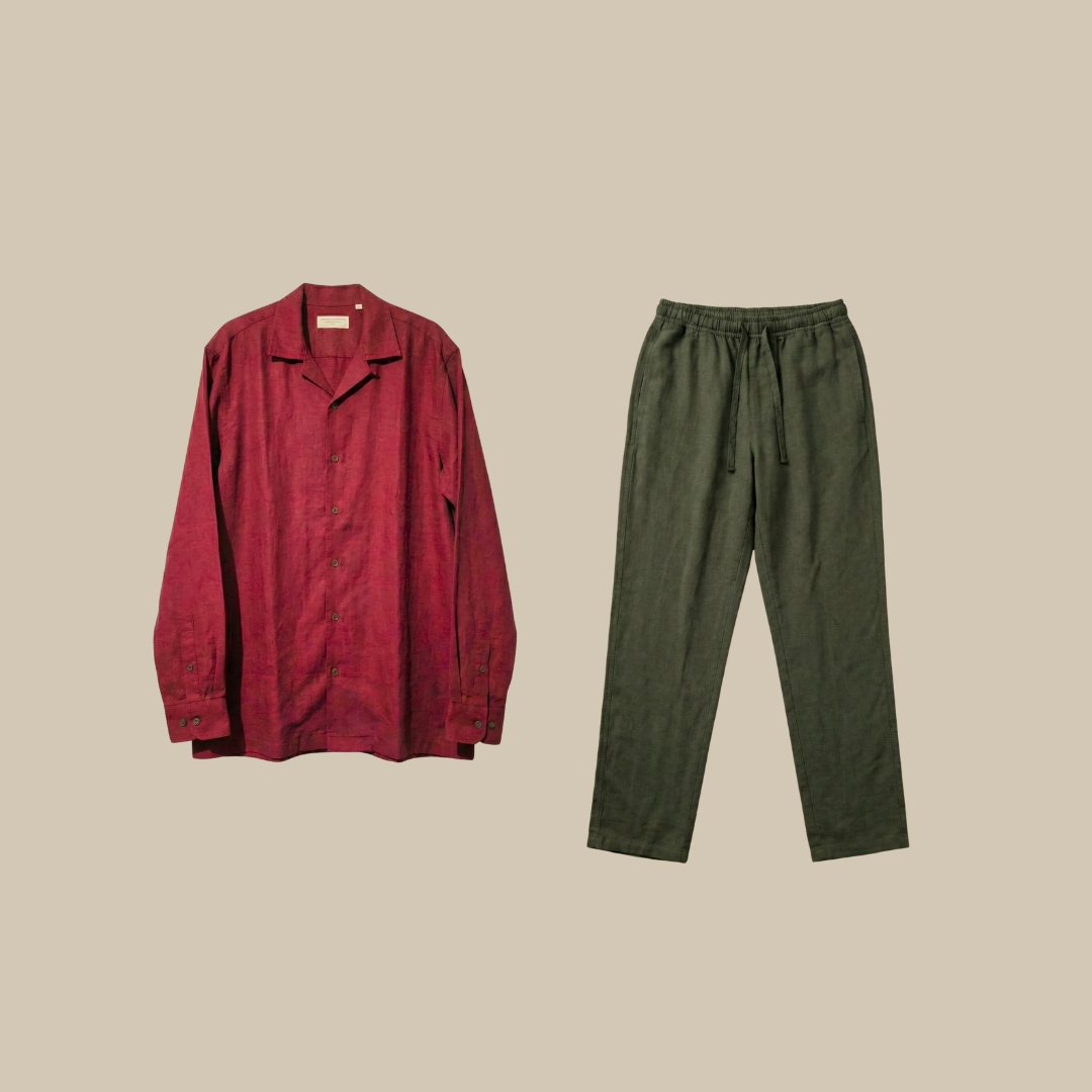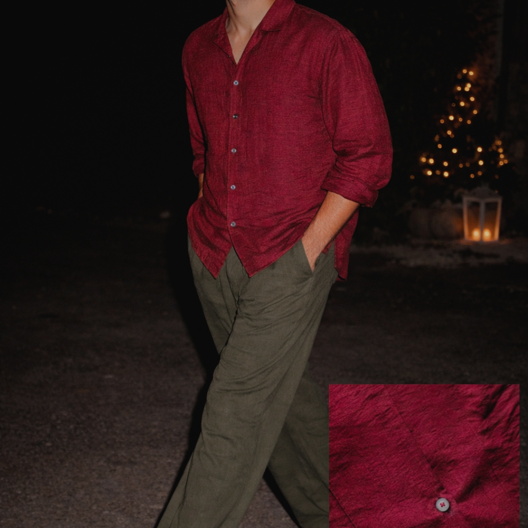 Wear the Noel Outfit together for a calm, composed festive look, or style each piece separately. The maroon Cuban collar shirt pairs effortlessly with neutral tones, while the dark olive pant works across seasons with shirts, knits, or light outer layers.