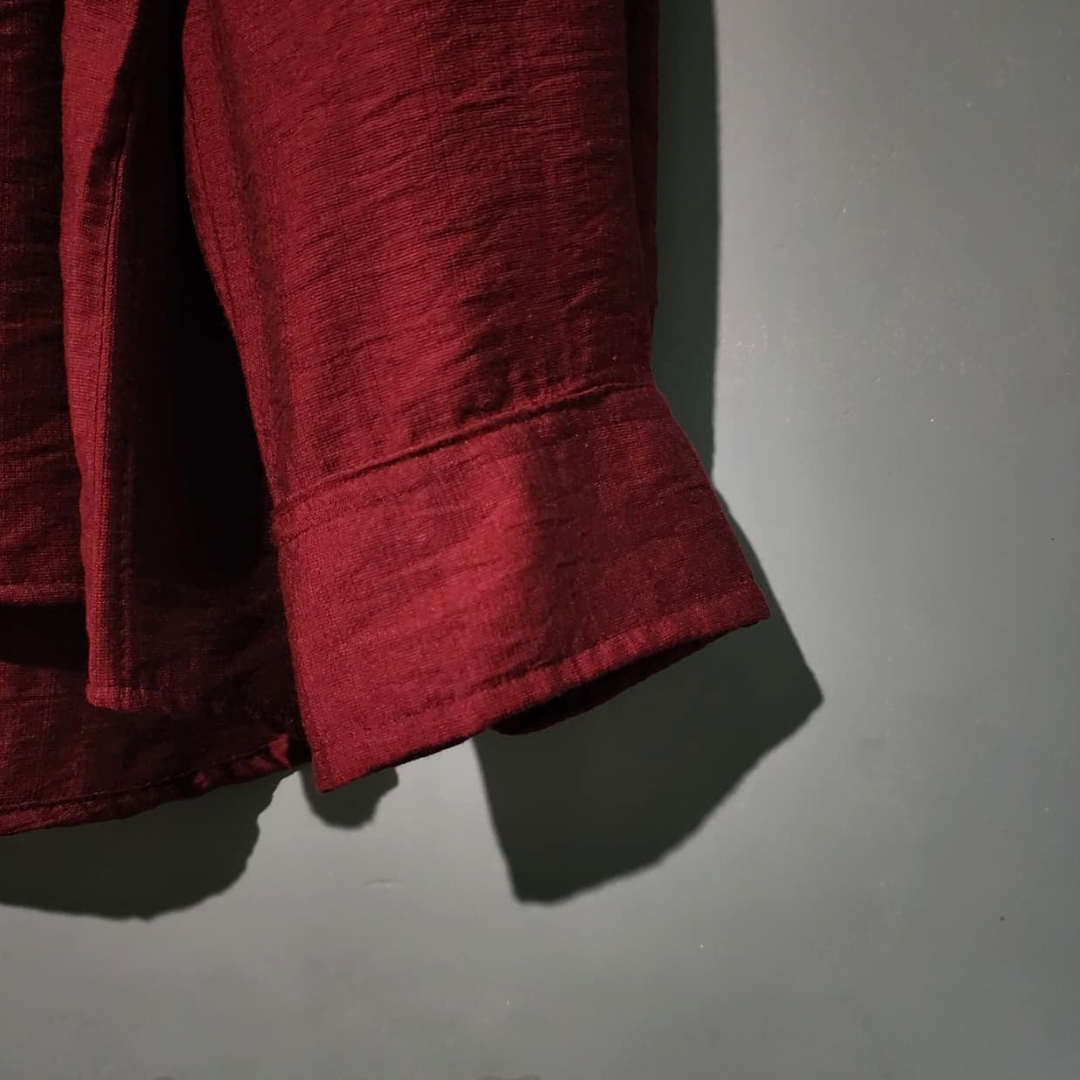 Crafted from washed cotton, the fabric carries a lived-in texture with subtle natural creases — a mark of real cotton rather than synthetic blends. The washed finish softens the maroon tone, giving it depth and warmth with a matte, understated look.