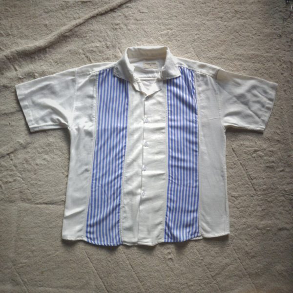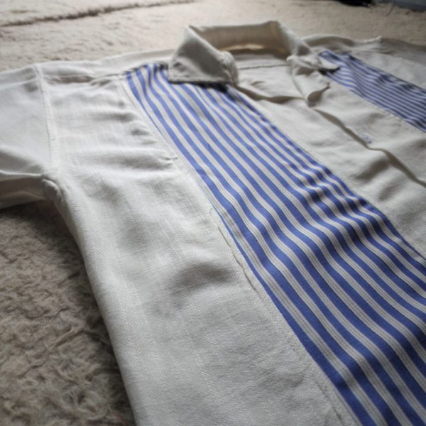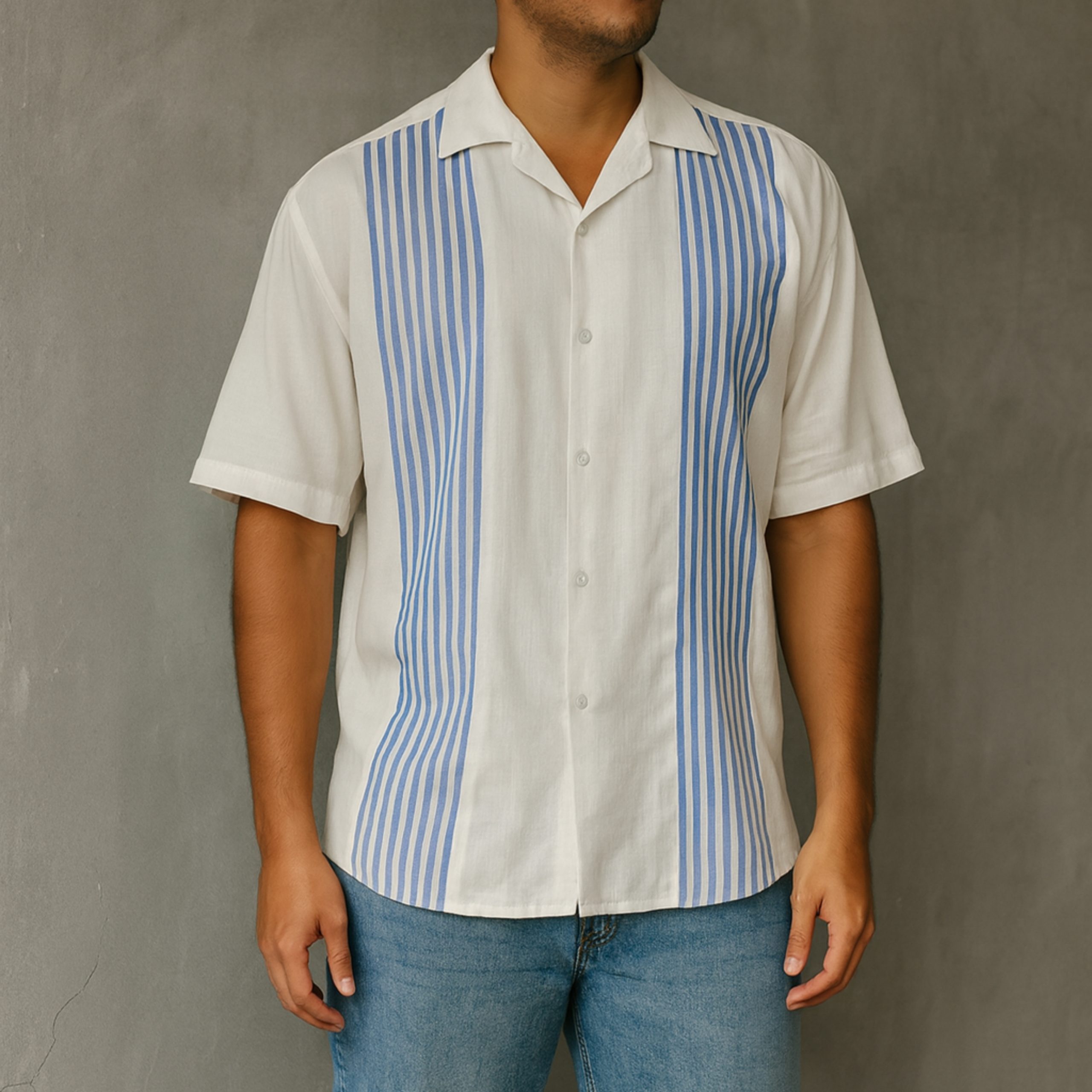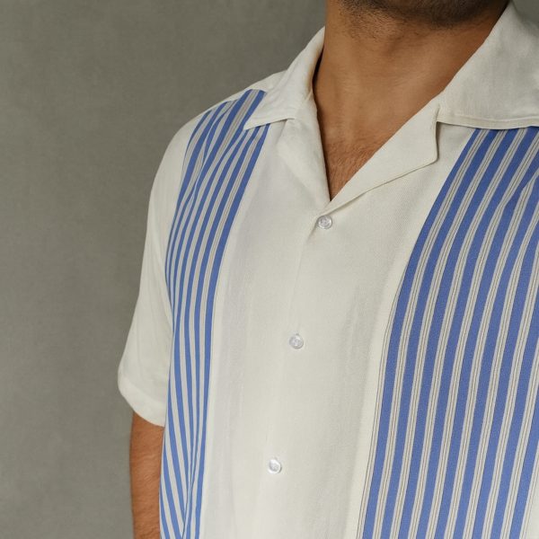 Soft linen meets crisp stripes in the Oceanic Marbella Patch Shirt, a relaxed Cuban-collar design built for warm days and slow movement. Oversized and boxy, it combines an ivory linen base with perfectly aligned blue-and-white cotton stripe panels for a balanced, modern resort look. Lightweight yet structured, this shirt brings effortless polish to spring–summer dressing.