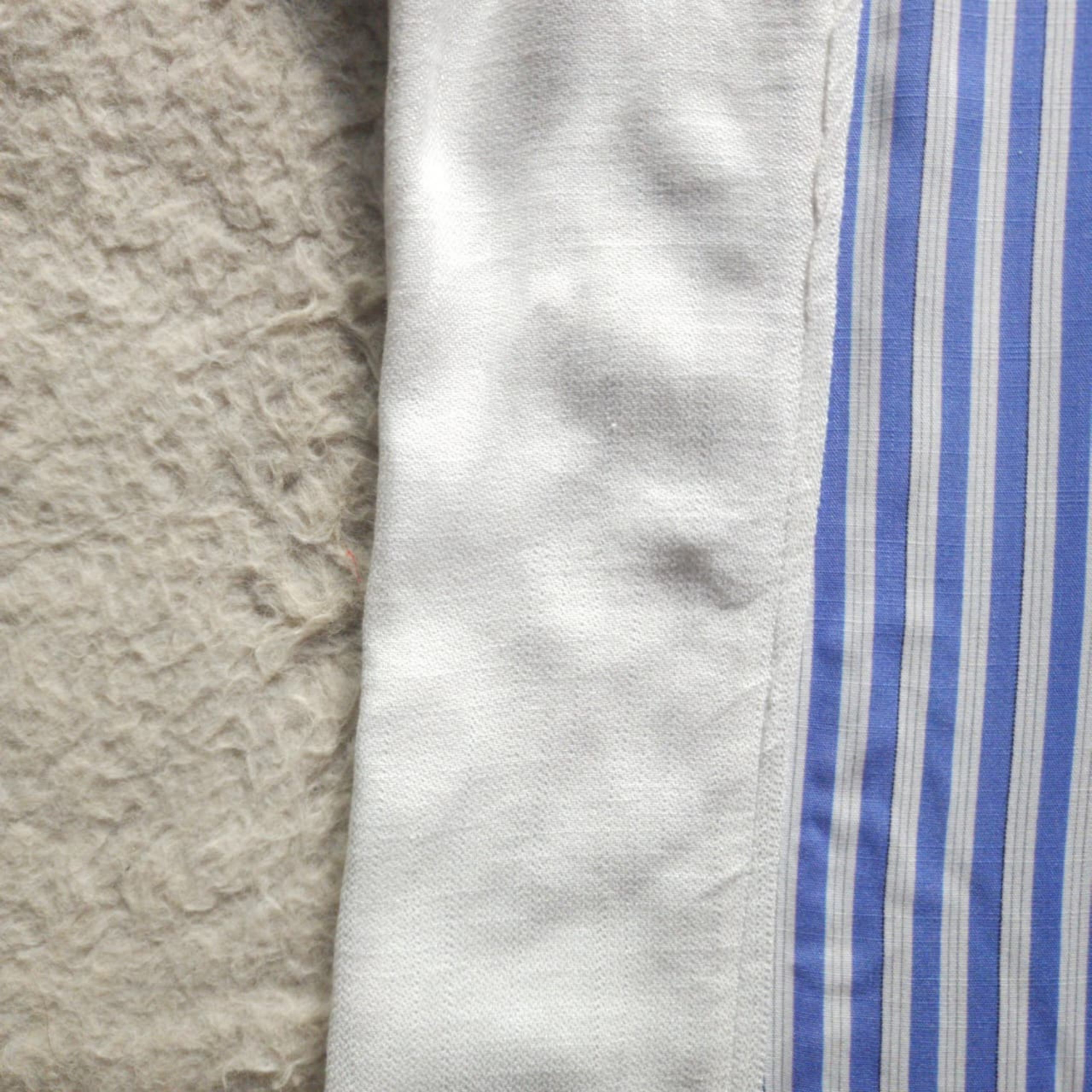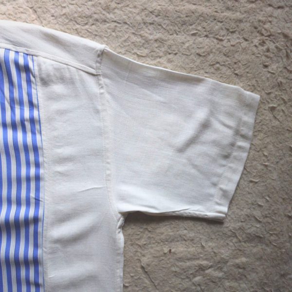 Two vertical blue-and-white stripe inserts frame the front, set between clean ivory linen panels for a striking yet understated contrast.