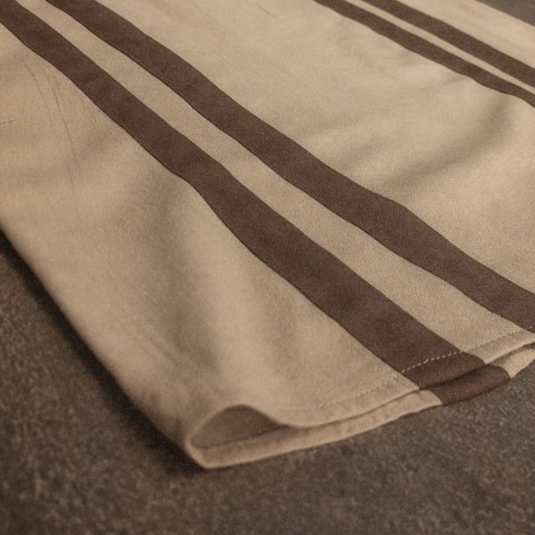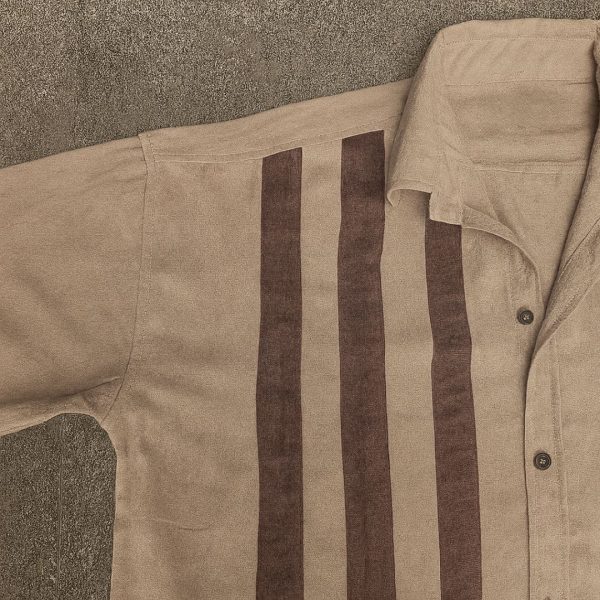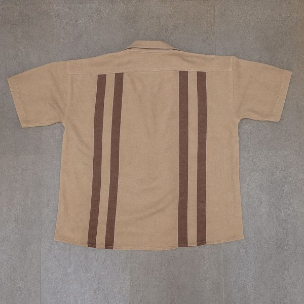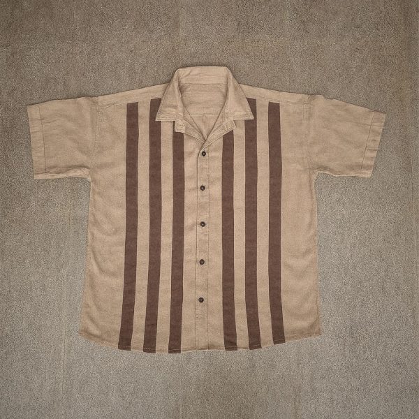 Six deep mocha stripes run cleanly down the shirt’s front, anchoring the design with balance and structure. The vertical orientation enhances the shirt’s flow and adds a subtle elongating effect.