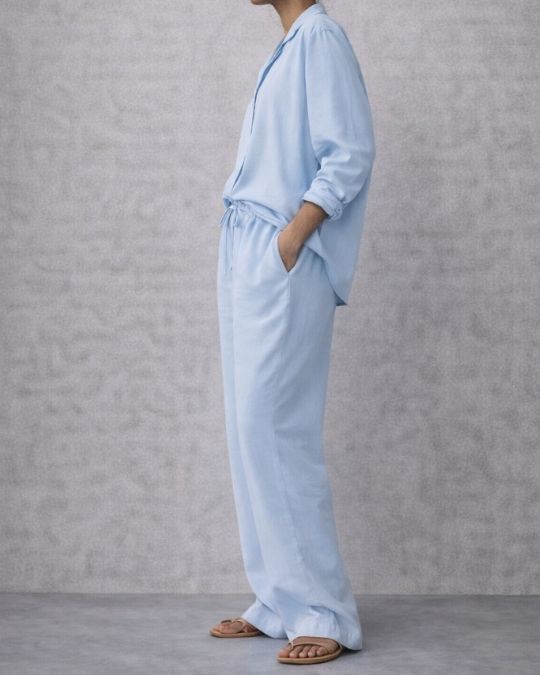 The Lans Oversized Sky Blue Long Sleeve Shirt & Long Pant set captures effortless refinement through clean lines, soft structure, and balanced volume.