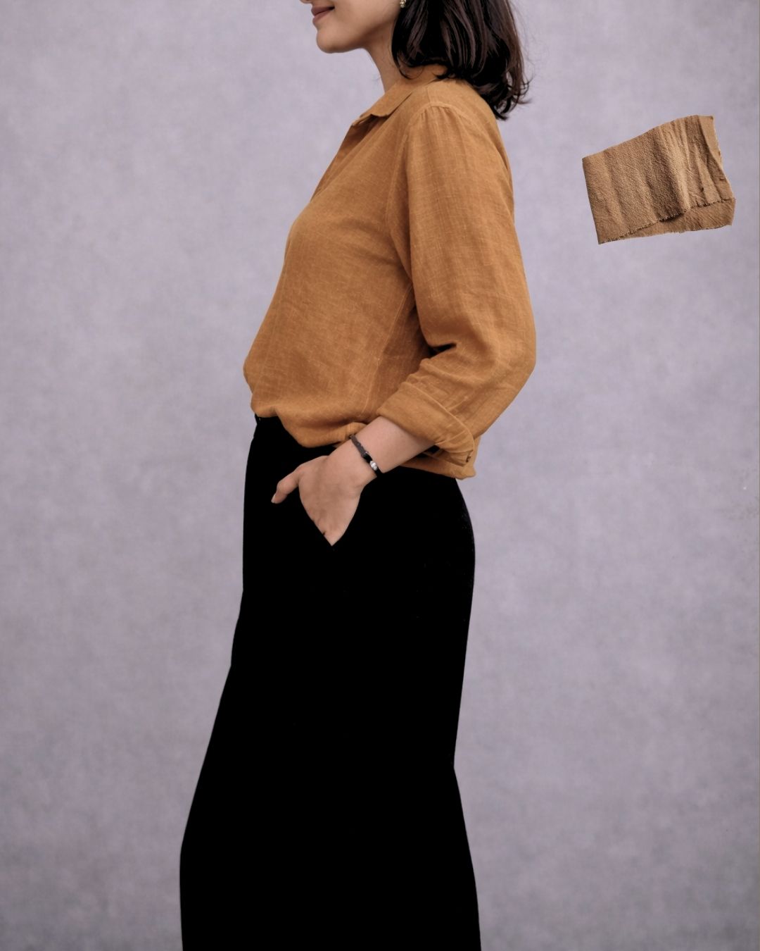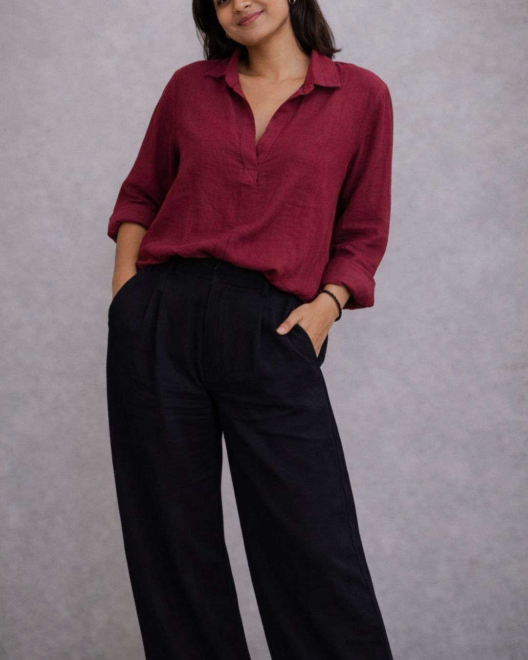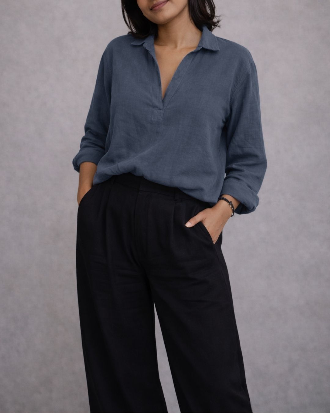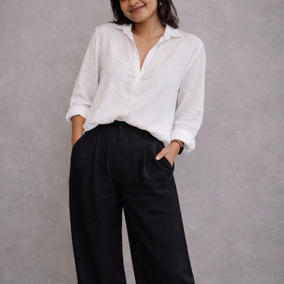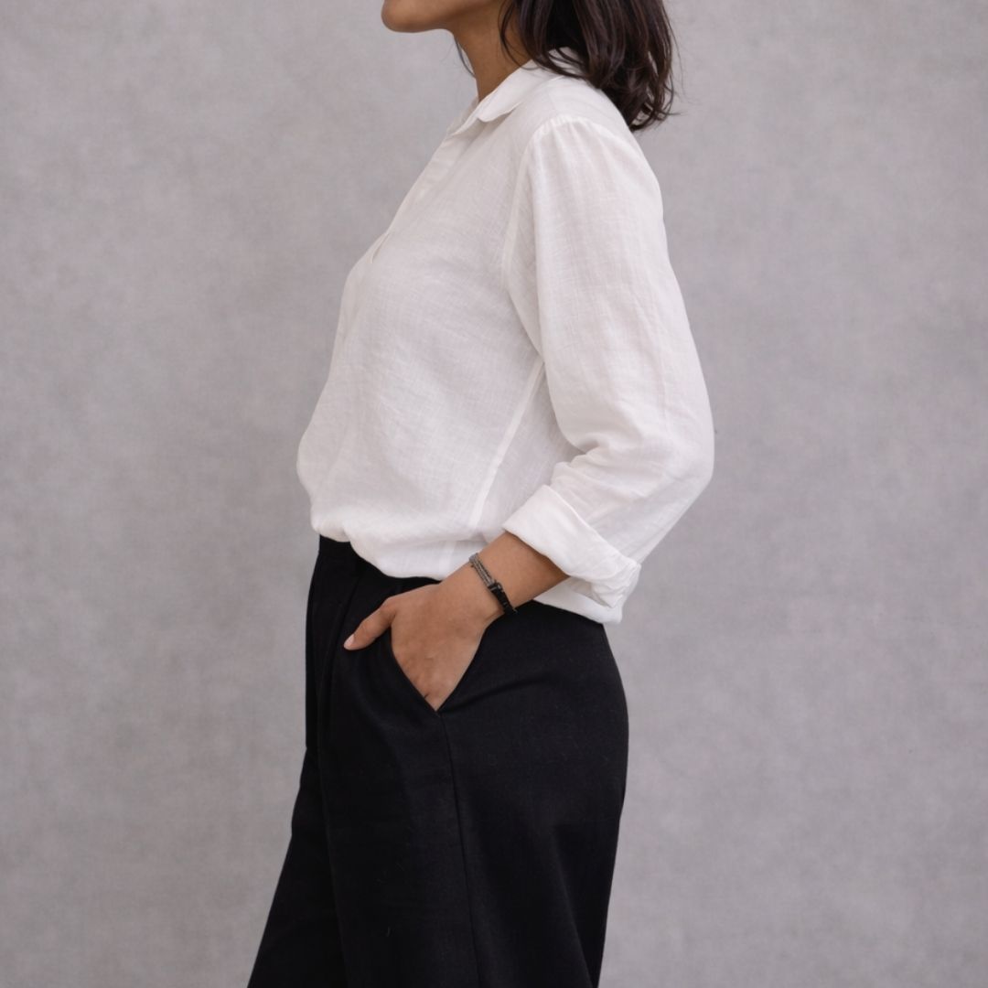 The sleeves fall with ease, slightly roomy and designed for movement. Whether worn tucked, untucked, half-tucked, or layered over a crop or camisole, the Vesper V Shirt adapts effortlessly to your style. It’s a piece that works from morning to evening, casual to refined, with simple accessories or none at all.
