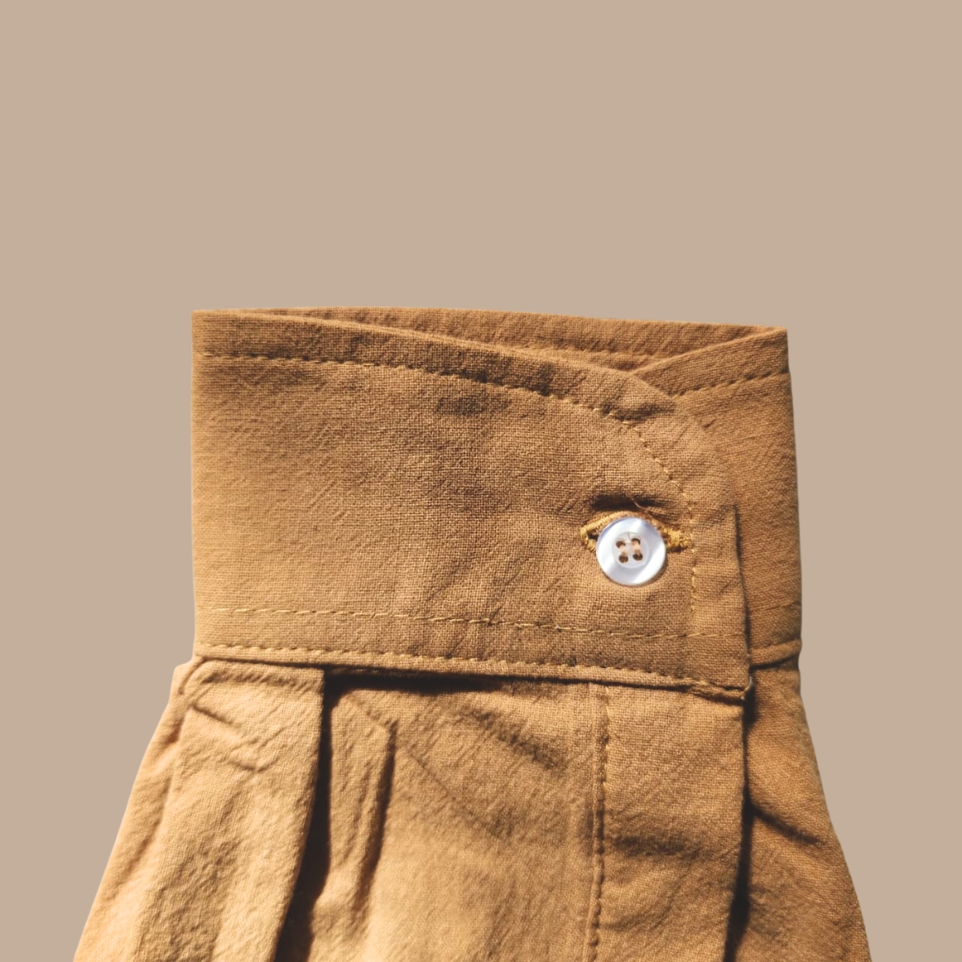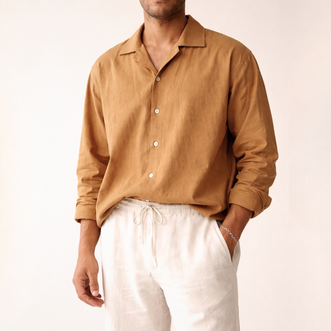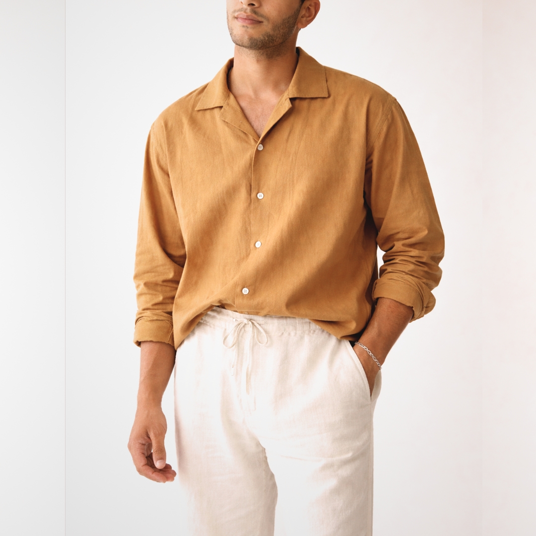 Finished in a warm Mustard Brown tone, the shirt brings a grounded, earthy character that feels both timeless and contemporary — perfect for everyday wear, resort styling, and elevated casual looks.