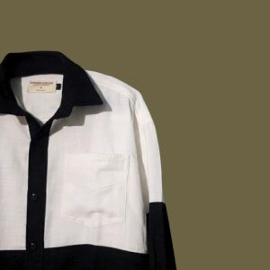 A defining feature, the shirt’s body is cleanly split into two halves—an upper section in soft ivory and a lower section in charcoal black. The horizontal color break is crisp and direct, lending modern contrast to a heritage silhouette.