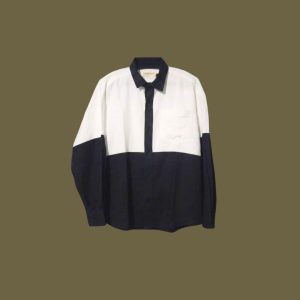 A defining feature, the shirt’s body is cleanly split into two halves—an upper section in soft ivory and a lower section in charcoal black. The horizontal color break is crisp and direct, lending modern contrast to a heritage silhouette.