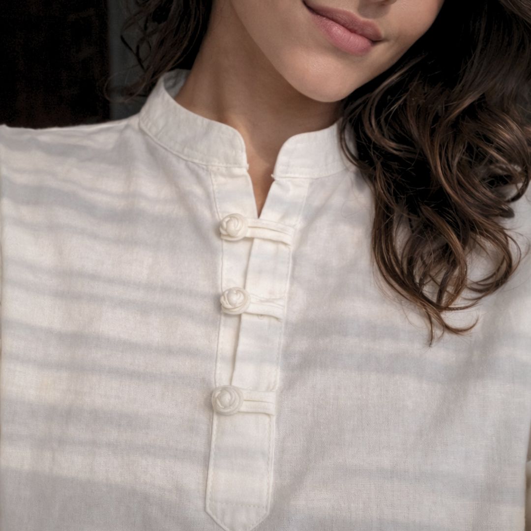 A defining feature of the shirt is the Loopline fabric closure, crafted from the same cotton fabric as the garment. Each loop is carefully formed to create a seamless tonal finish, offering subtle artisanal character without excess decoration.