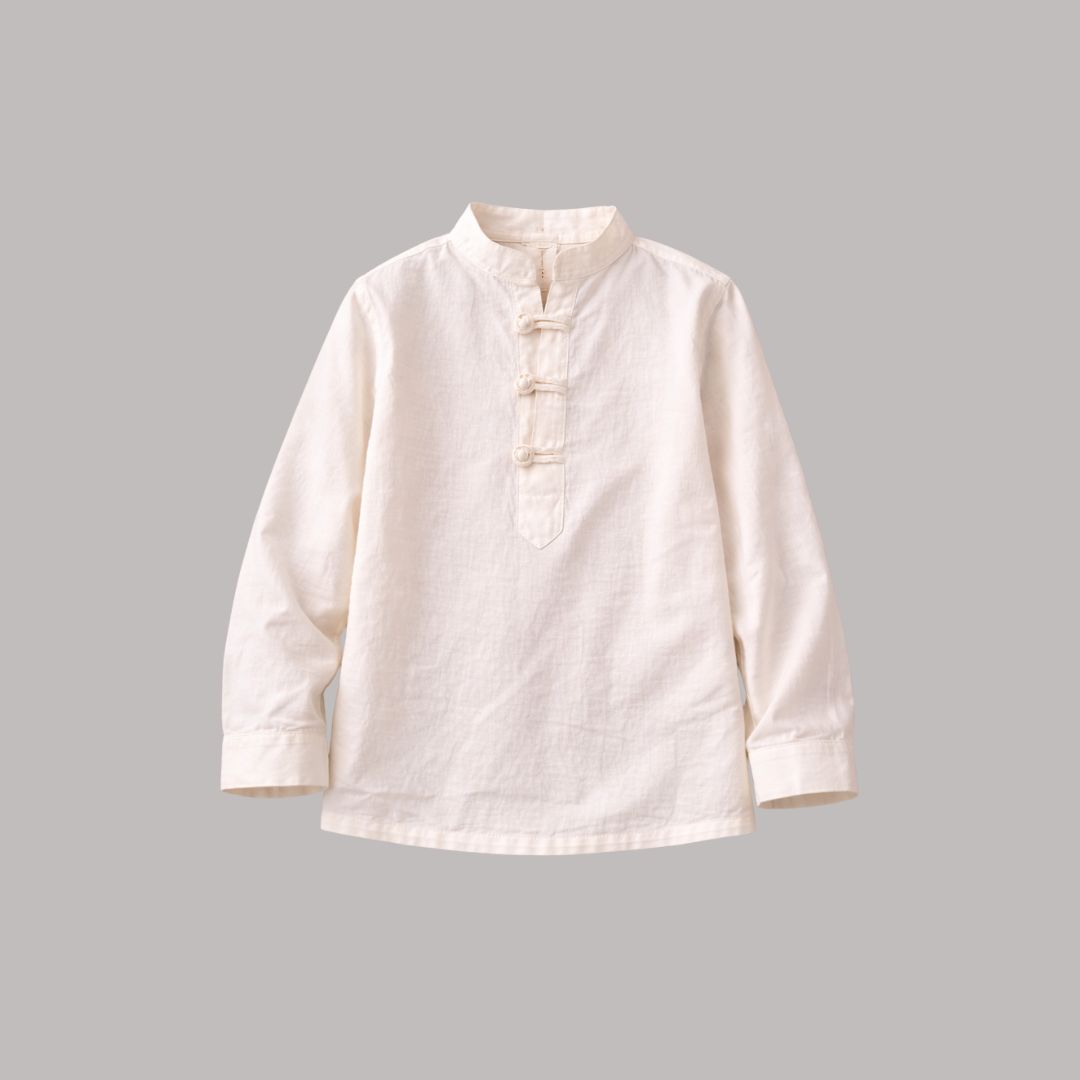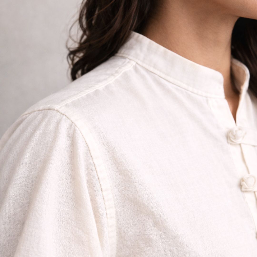 A clean mandarin collar frames the neckline with subtle structure, offering a refined alternative to traditional collars. The minimal neckline design keeps the shirt modern while preserving heritage influence.