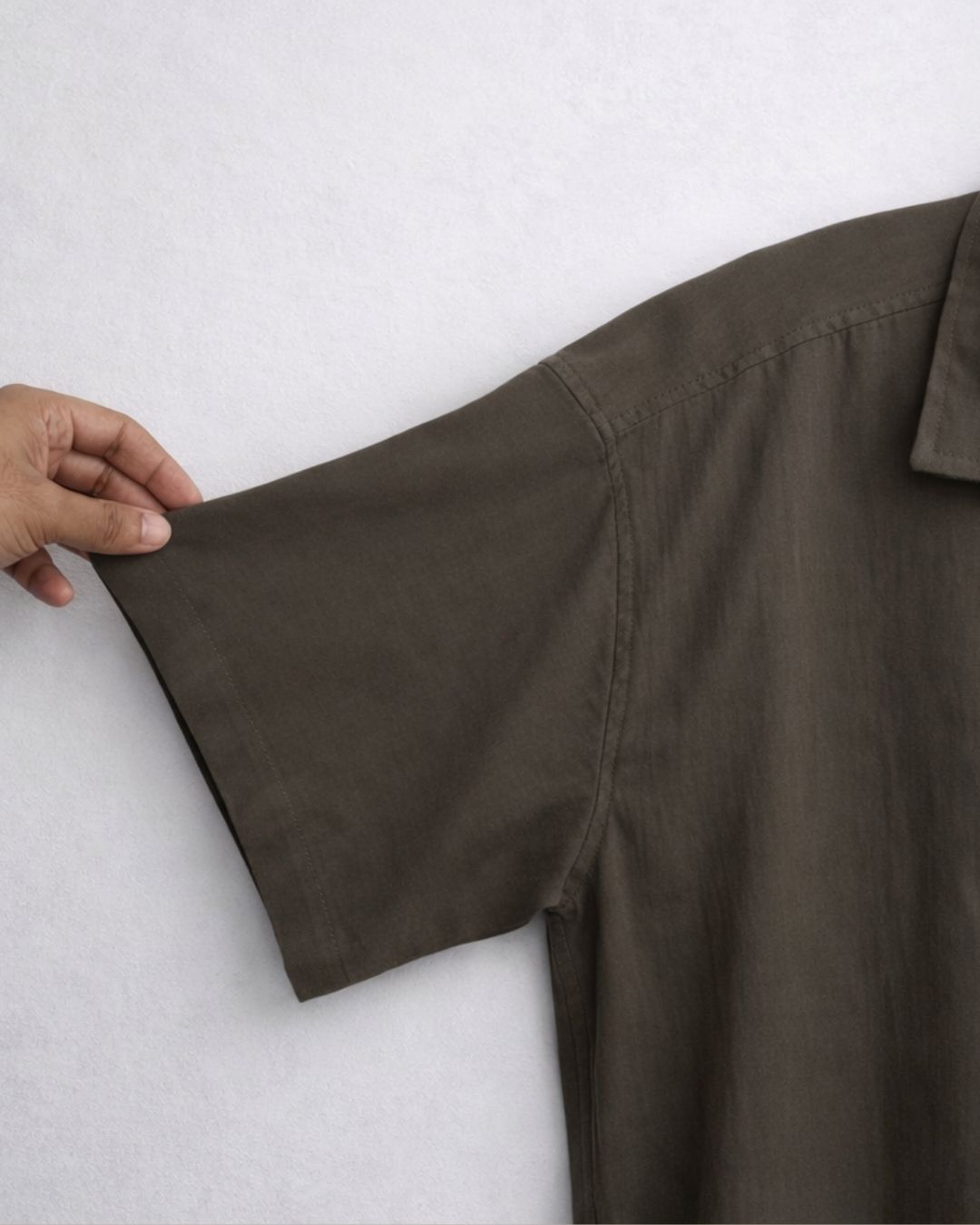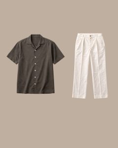 The deep charcoal olive tone grounds the look with quiet depth, while the off-white pant introduces lightness and refinement. Together, they create a silhouette that feels composed, breathable, and effortlessly elevated.