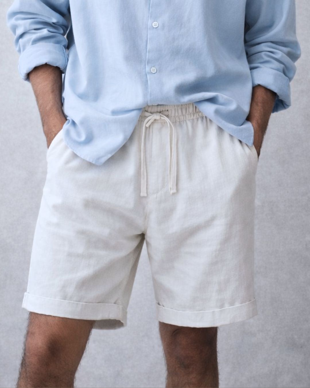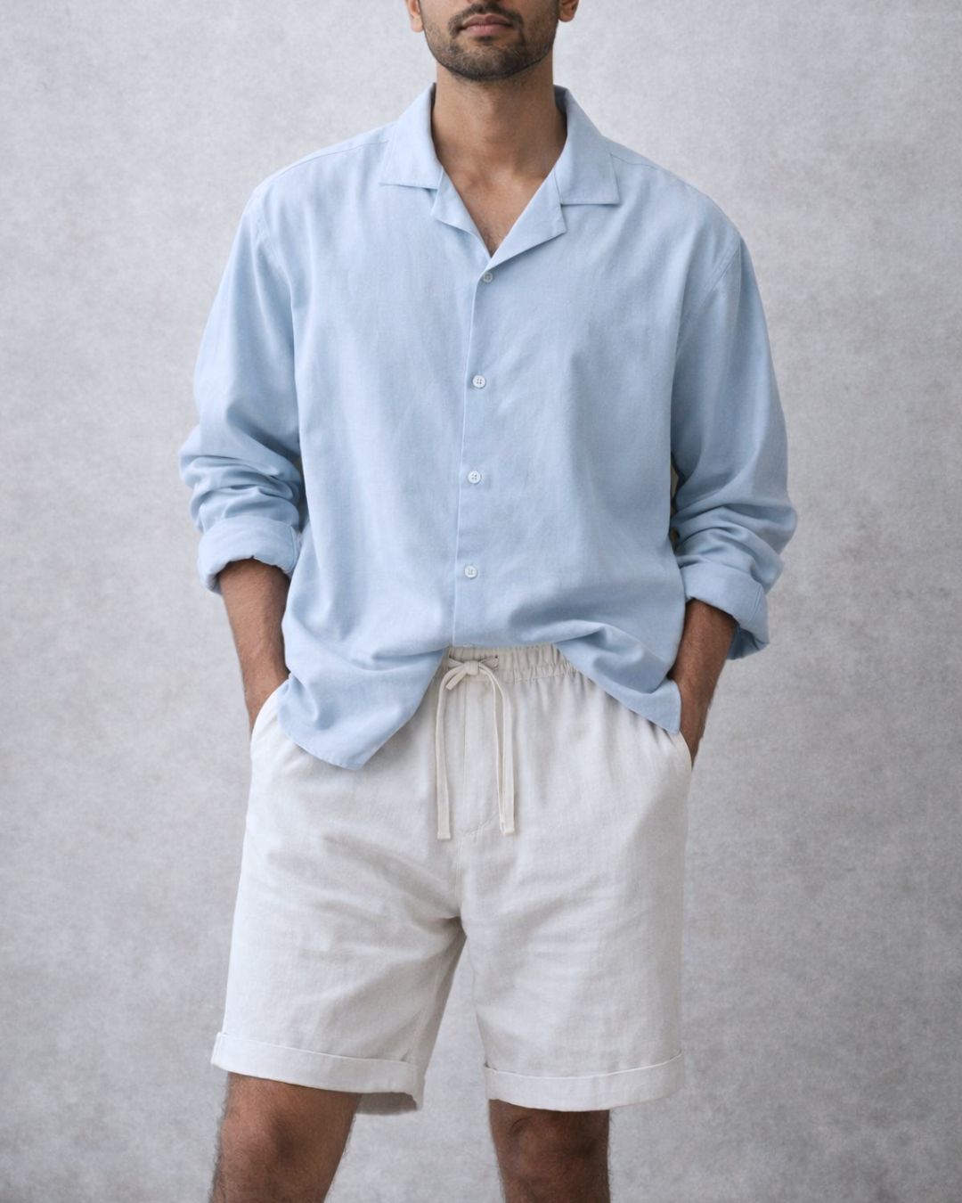 The Daves Cut Oversized Cotton Shirt & Wonderwall Washed Linen Shorts Outfit combines two wardrobe essentials into one balanced look: a crisp shirt in cooling ice blue, paired with relaxed shorts in washed linen. Together, they embody a refined yet laid-back approach to warm-weather dressing—structured up top, easygoing below.