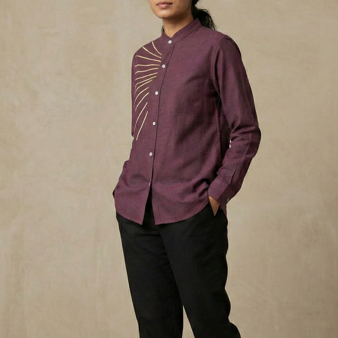 The rich wine-maroon handloom linen forms a deep, elegant base, allowing the gold accents to stand out with a warm, graceful glow. The diagonal piping composition across the chest creates a sense of movement and luxury without being loud — a design language rooted in heritage yet refined for modern simplicity.