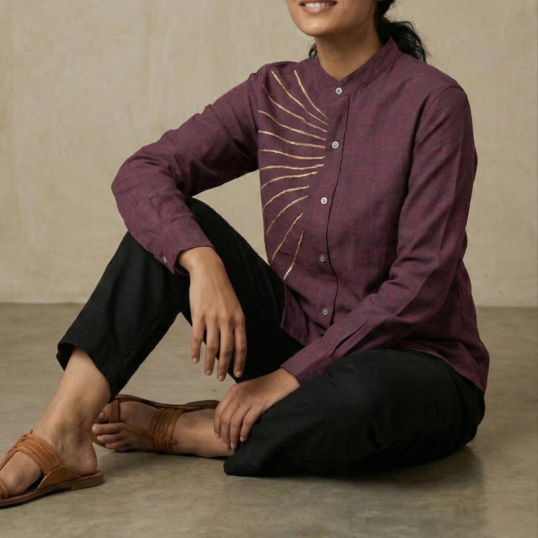 The Heritage Gold Stitch Shirt is a celebration of pure handcraft — created for those who value artistry, intention, and the quiet beauty of slow fashion. Made from breathable handloom linen and finished with individually hand-stitched gold piping, this piece carries the unmistakable character of human hands and heritage craftsmanship.