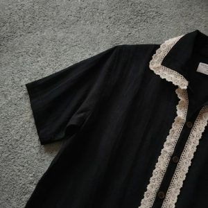The Claire Lace-Trimmed Cotton Shirt blends relaxed comfort with feminine vintage detailing. Crafted from soft, breathable cotton, this short-sleeve black shirt is accented with delicate ivory crochet lace around the collar and button placket — creating a subtle, heritage-inspired charm that stays modern, minimal, and easy to style.