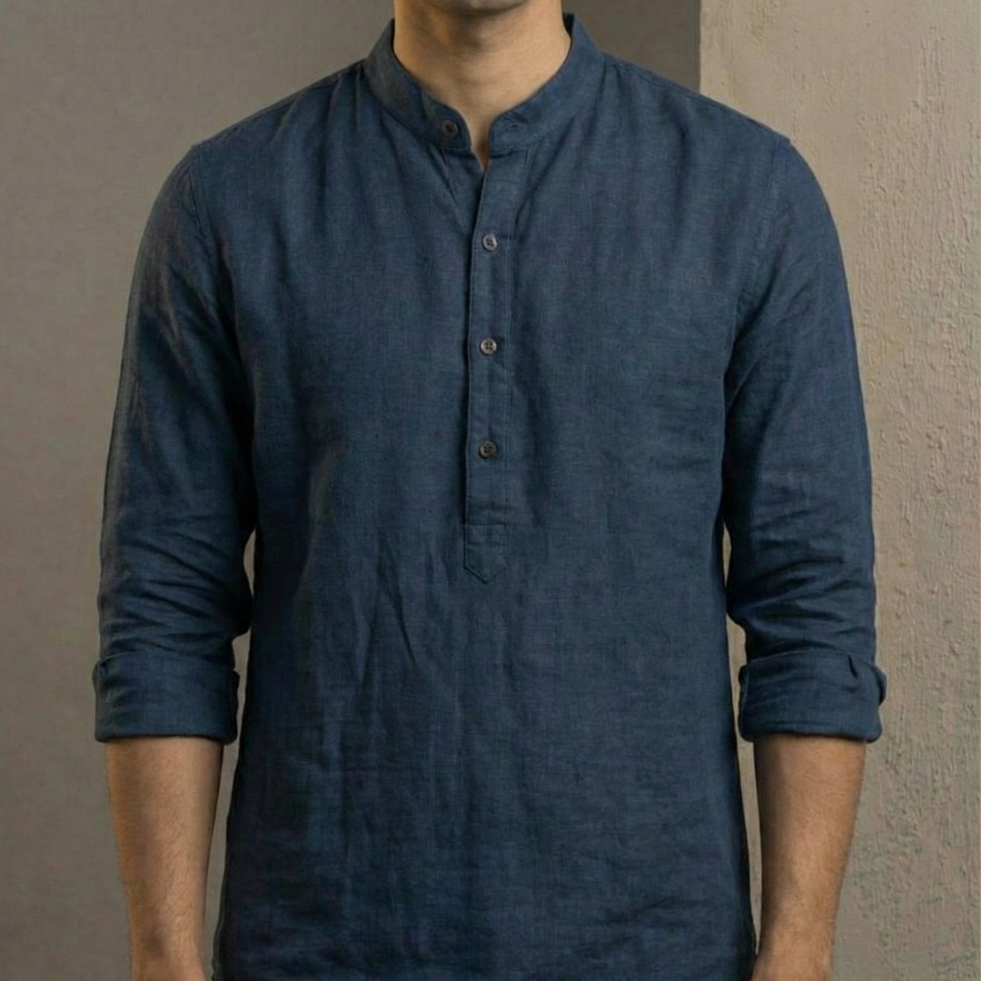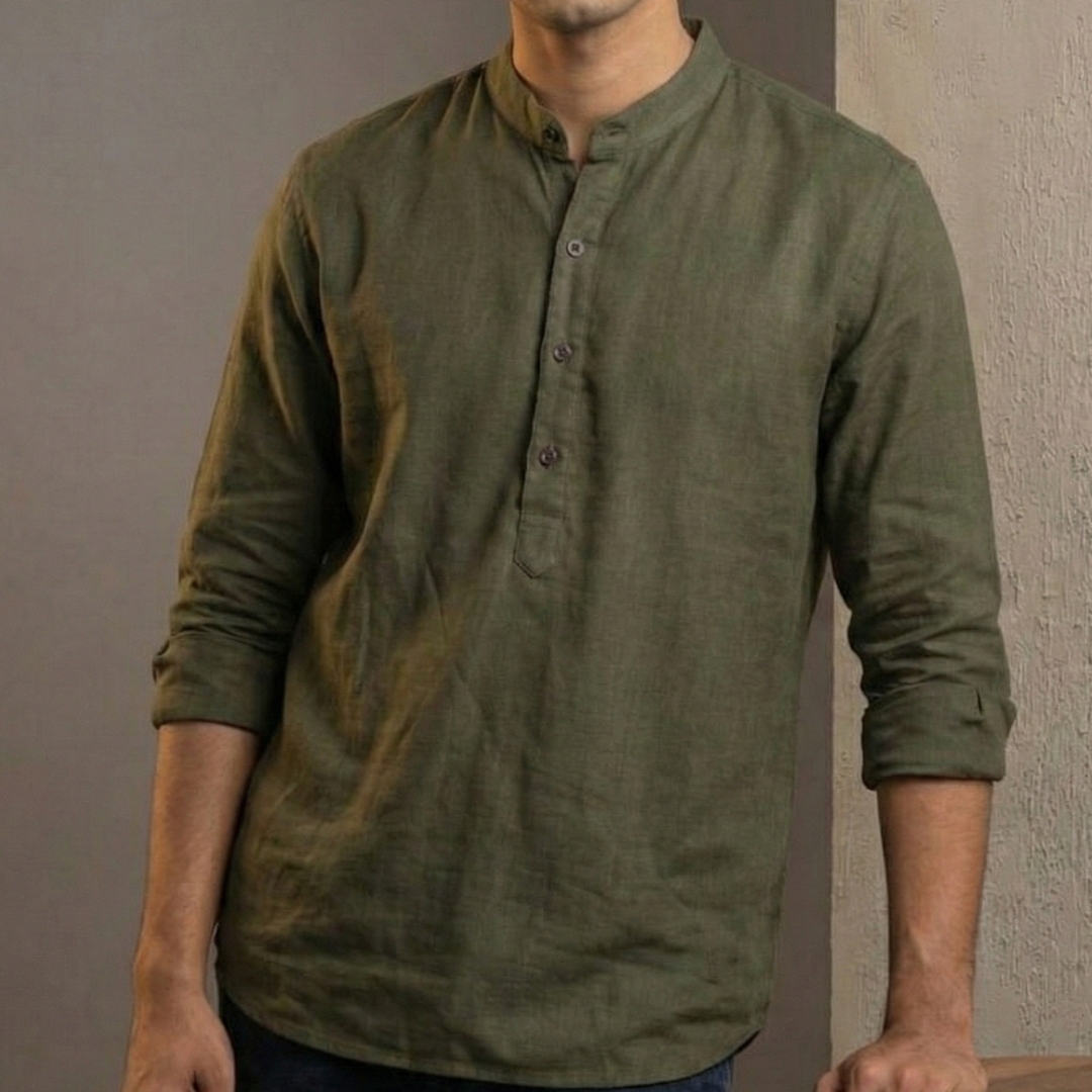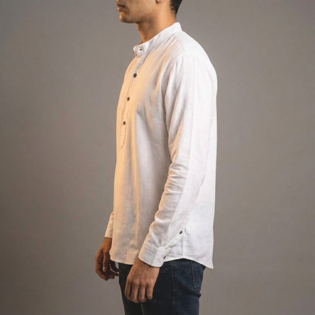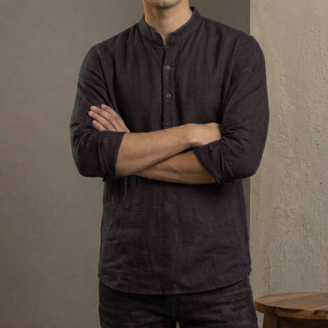 Relaxed cotton mandarin collar long sleeve shirt made in Sri Lanka, designed for comfort, breathability, and effortless everyday wear.