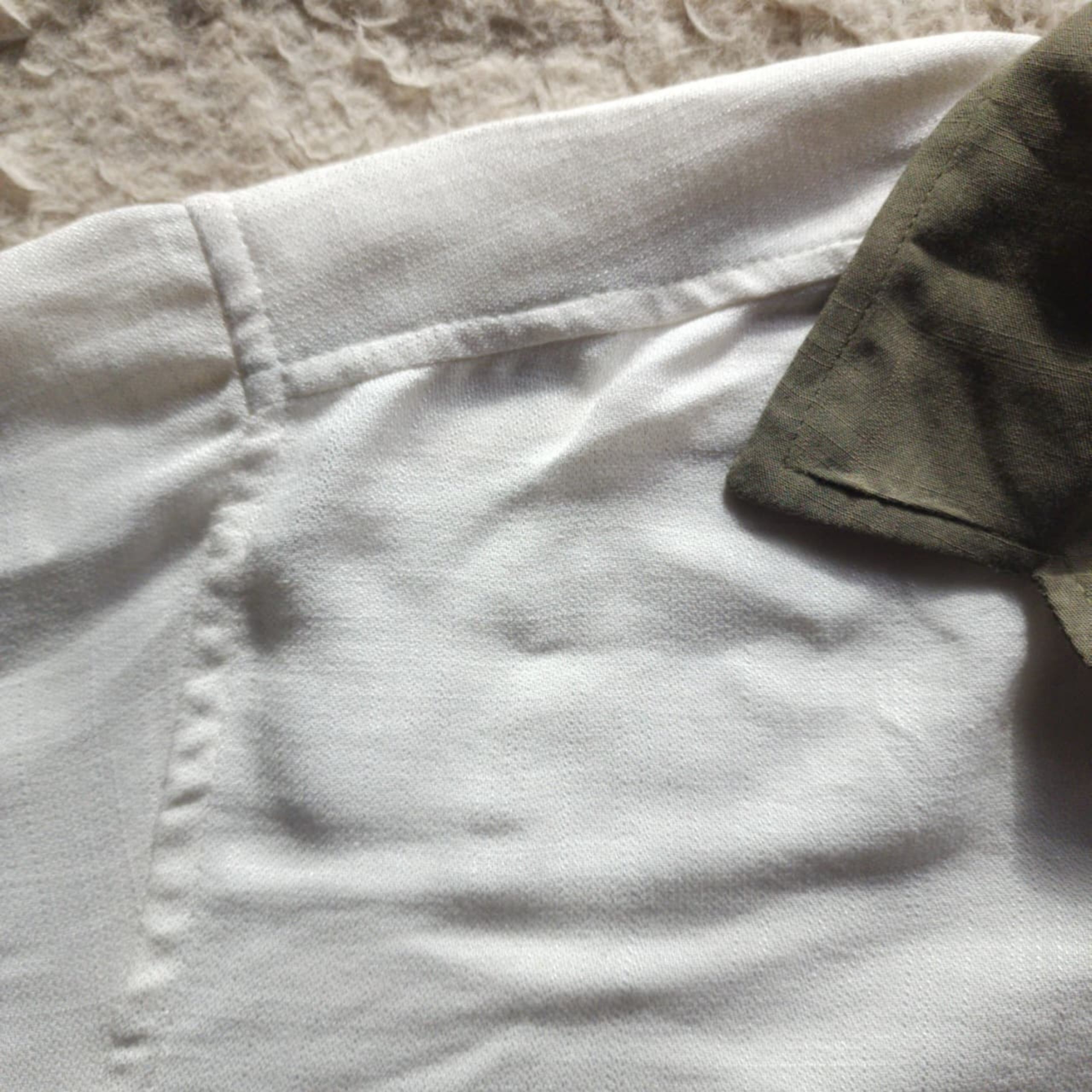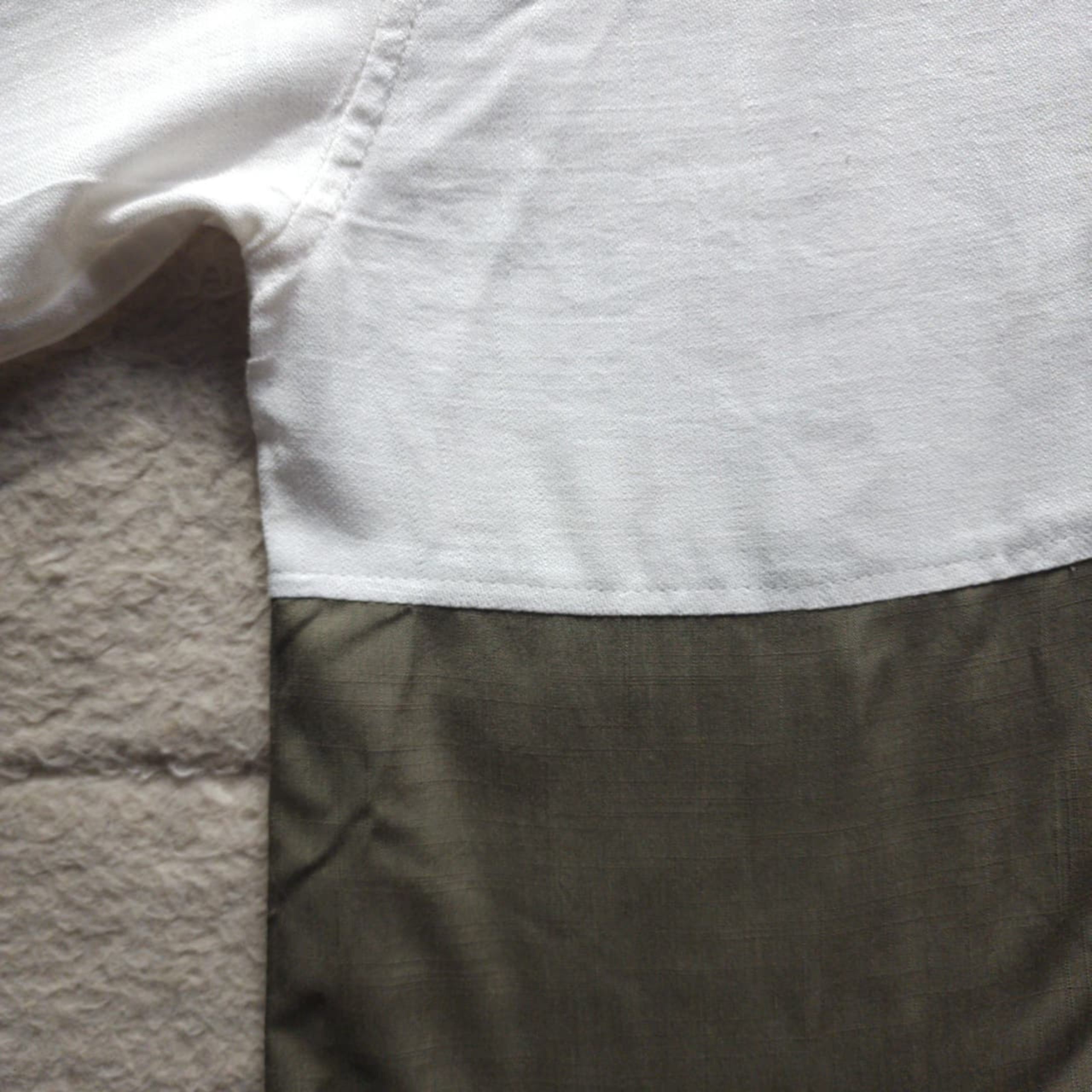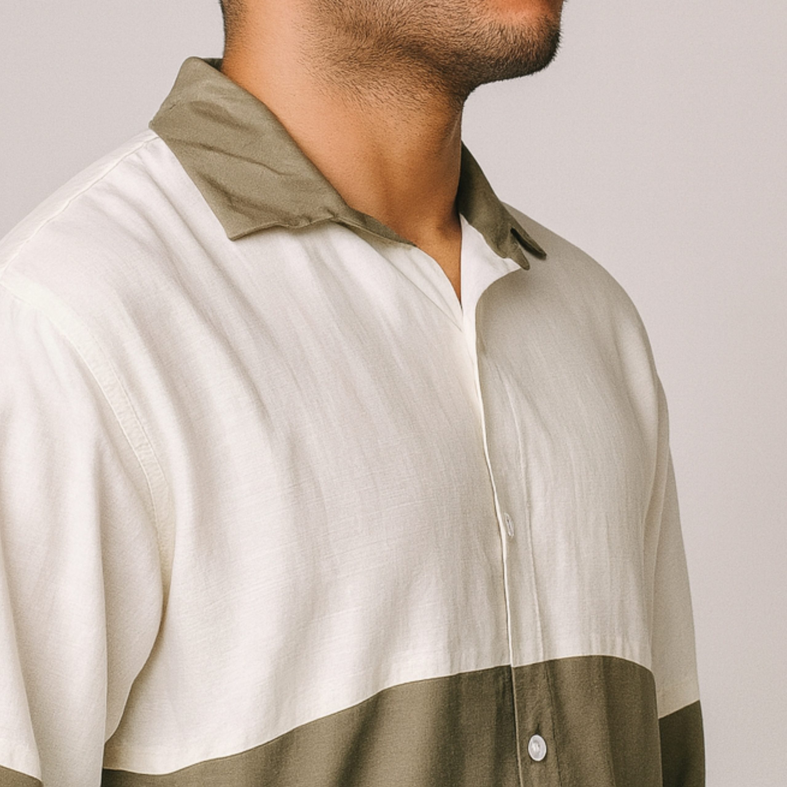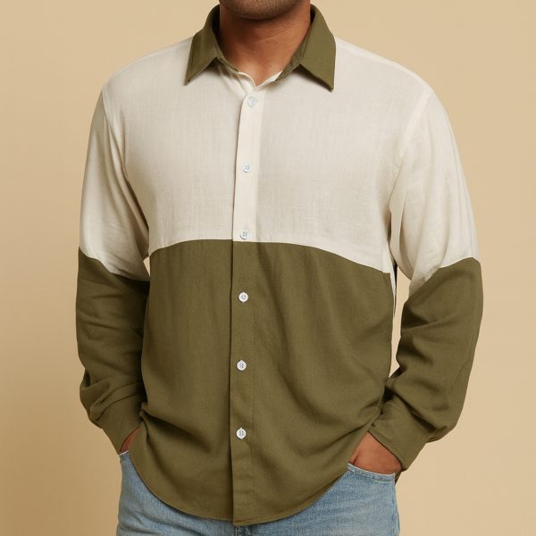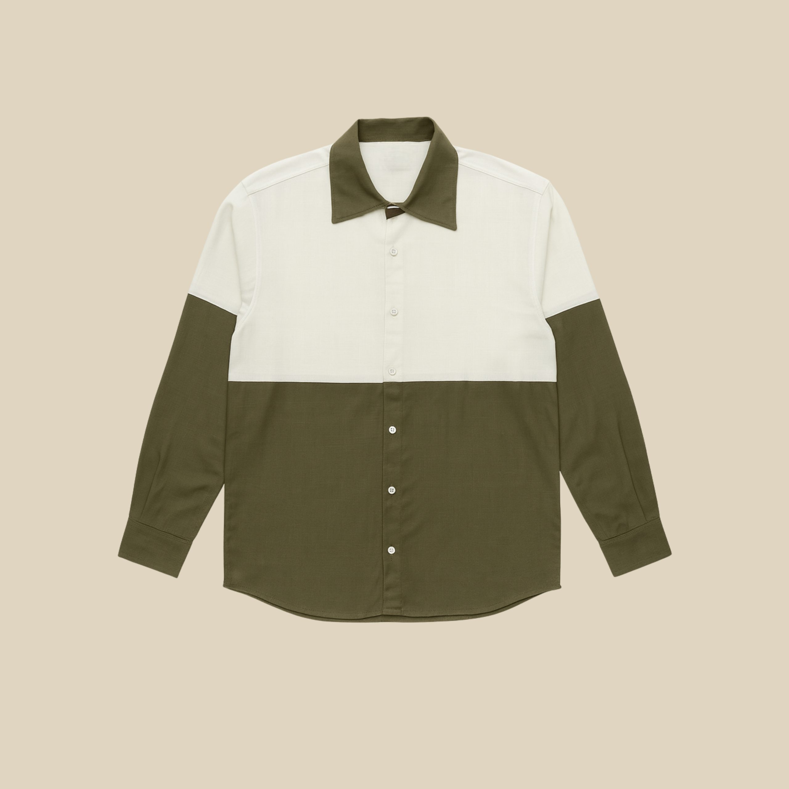 Off-white upper body and sleeves flow into olive-green lower panels, collar, and cuffs for a balanced yet eye-catching contrast.