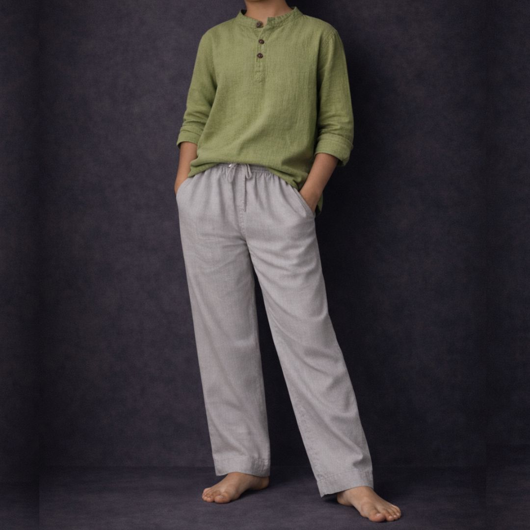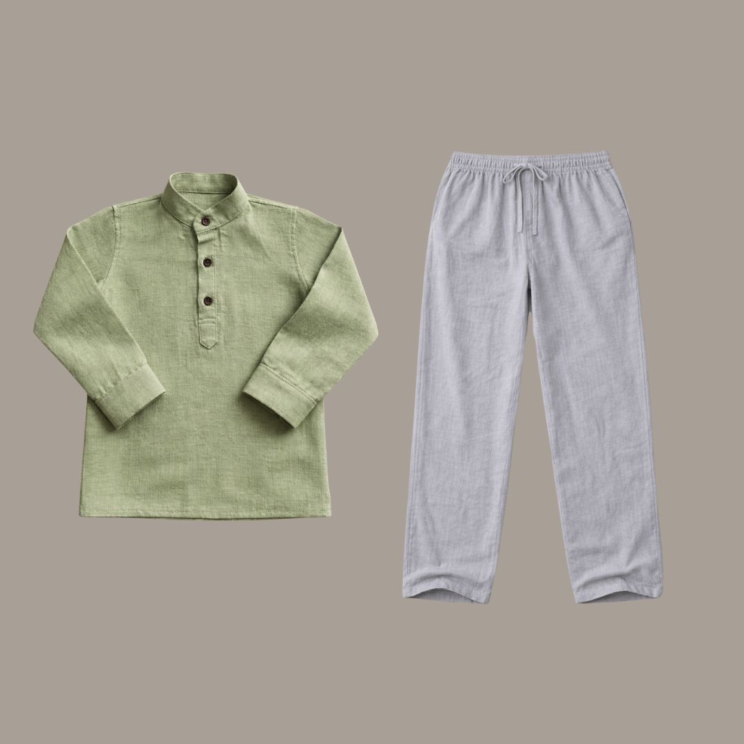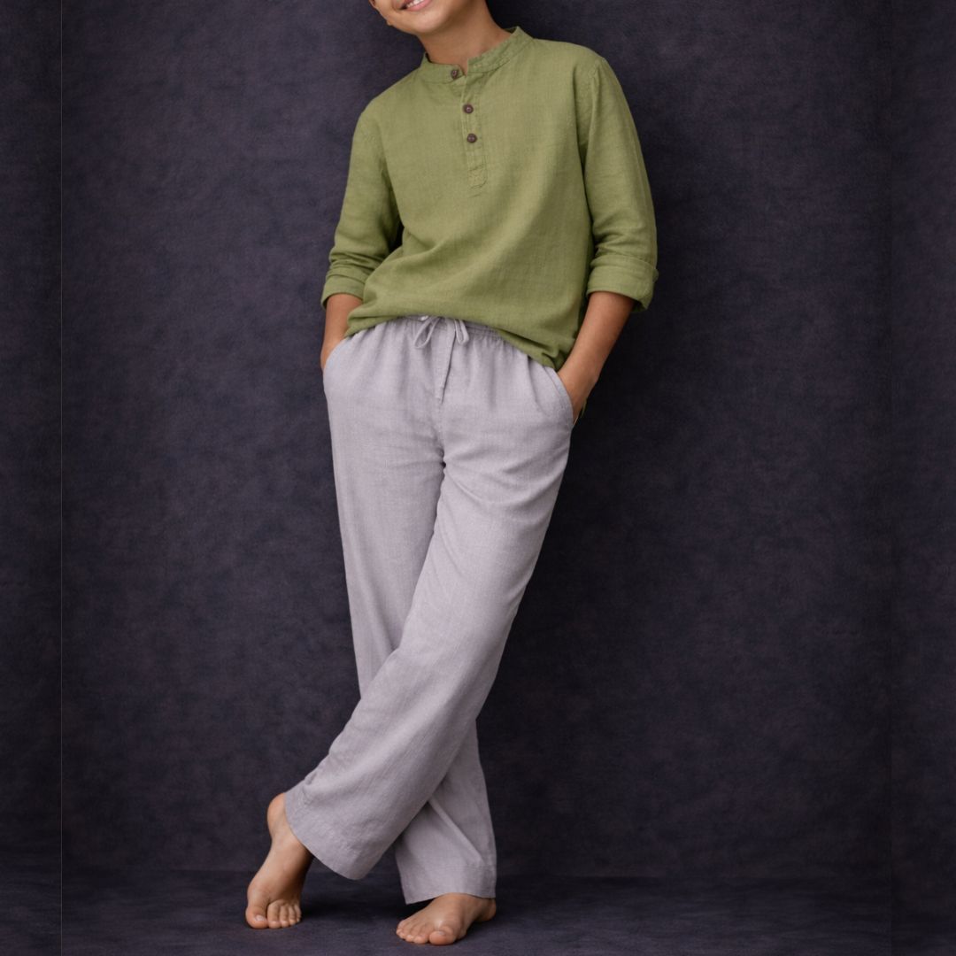 The Lans Relaxed Resort Kids Unisex Full Outfit – Ash & Olive Green is designed for effortless comfort and playful freedom, bringing together a relaxed resort shirt and matching long pants in a calm, easy-to-wear set for everyday adventures.