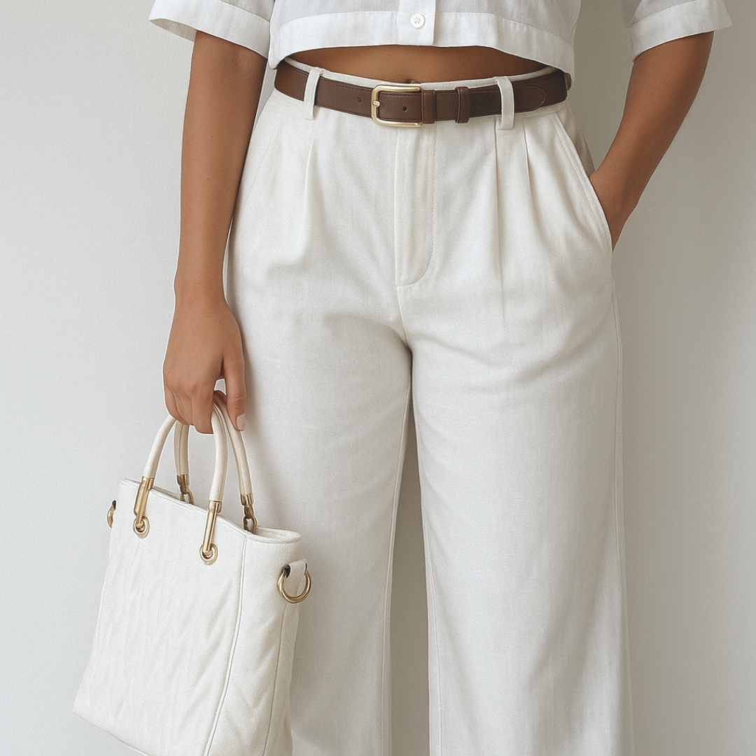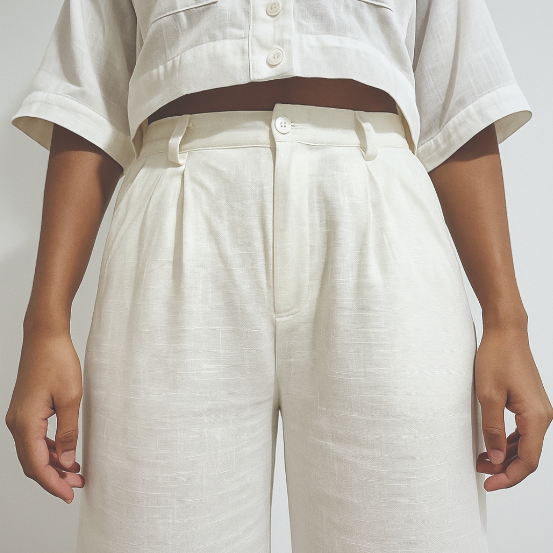 Pair it effortlessly with cropped blouses, oversized Cuban shirts, or minimal linen tops for a look that feels refined, modern, and timelessly relaxed.