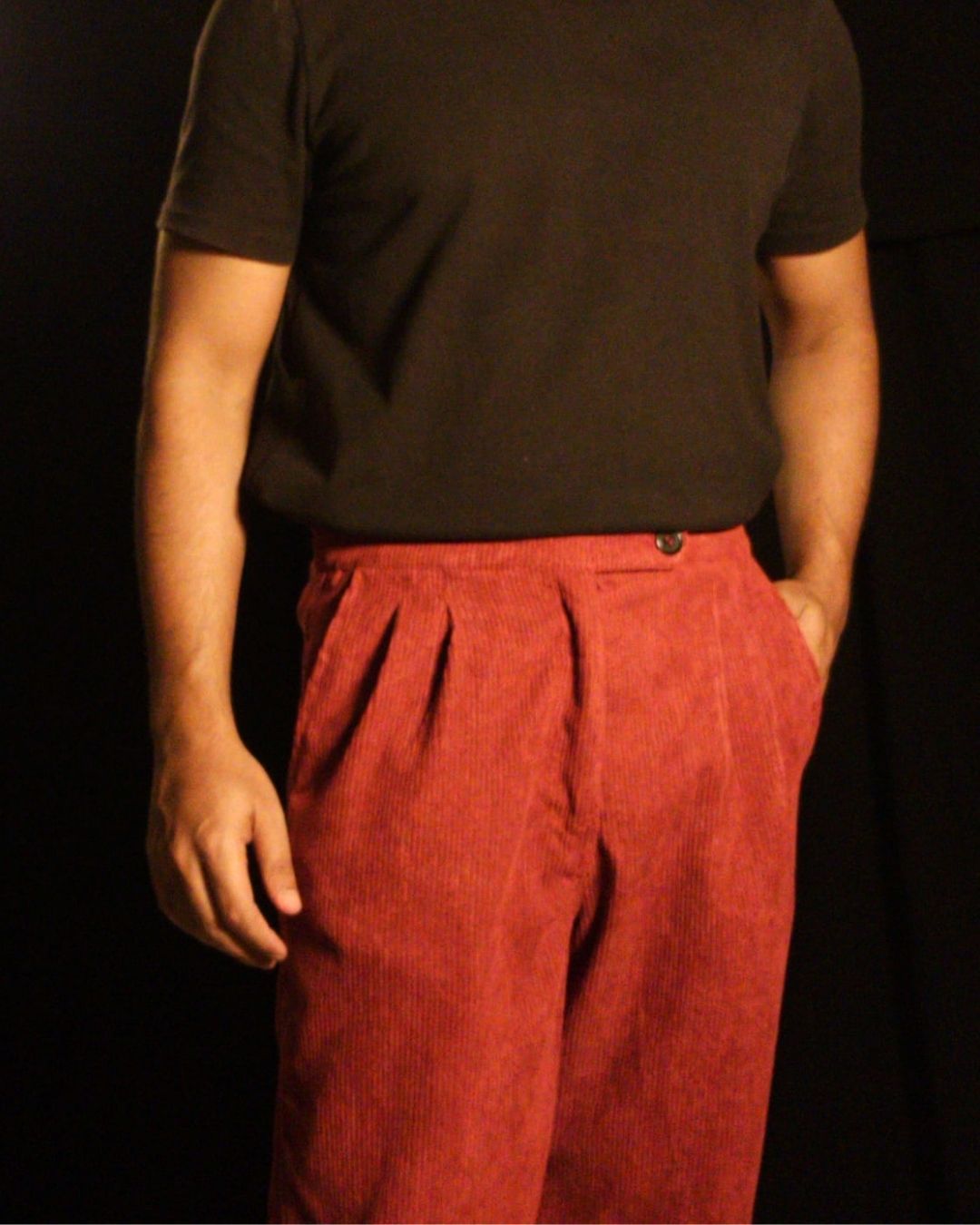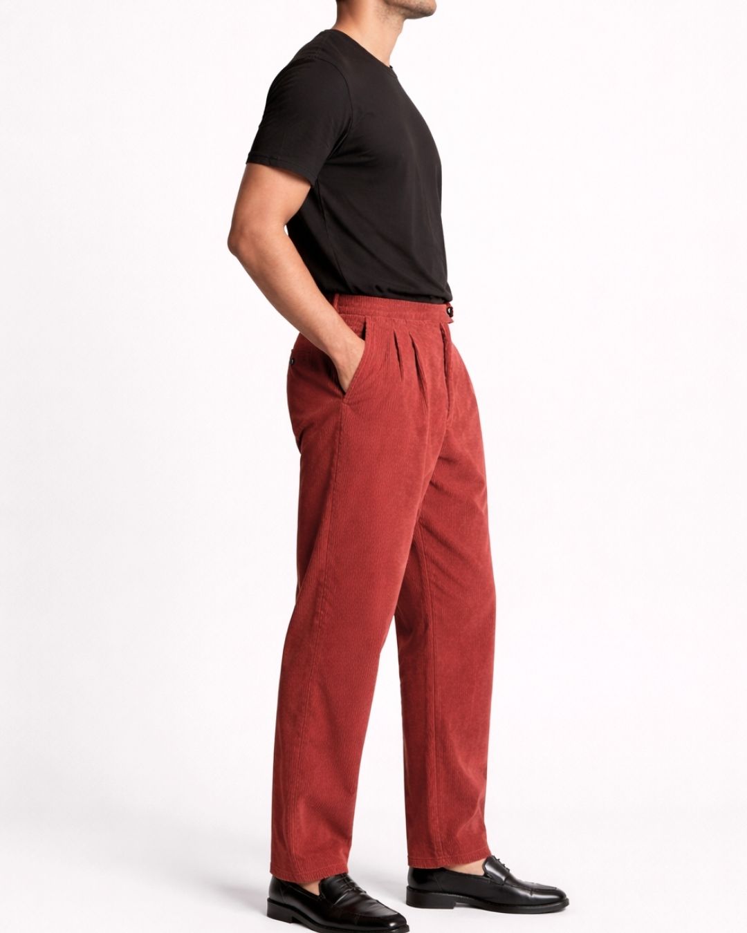 The rust red color tone brings a unique identity to the pant — warmer than maroon and softer than brick — making it a standout piece that remains easy to style across different outfits and seasons.