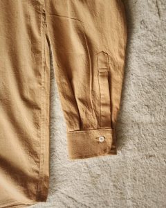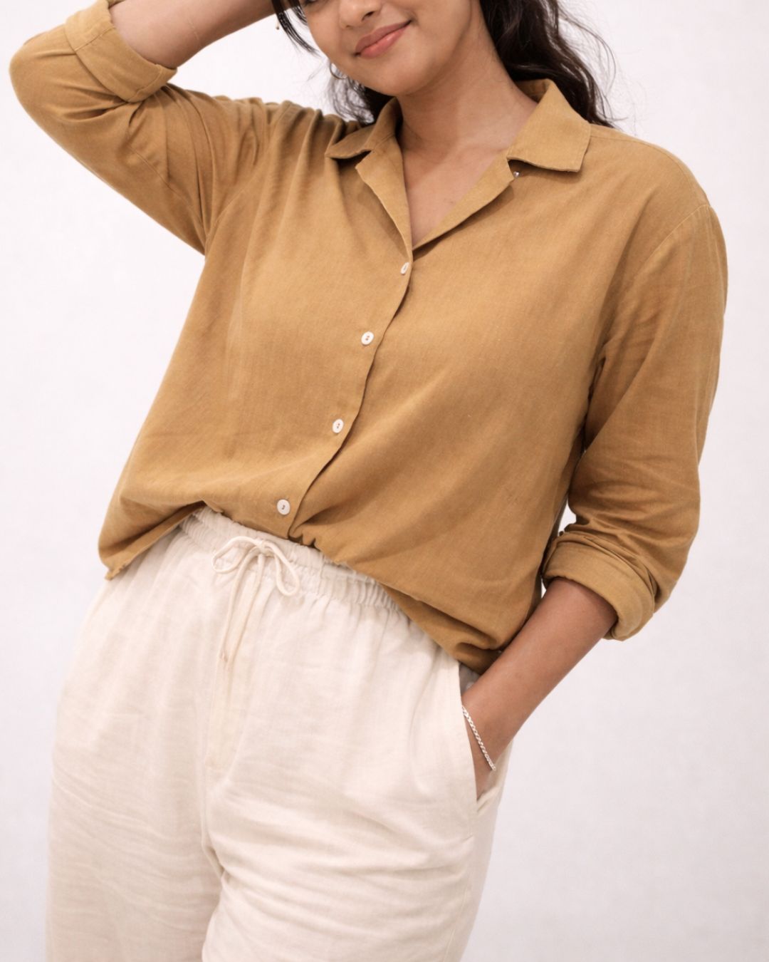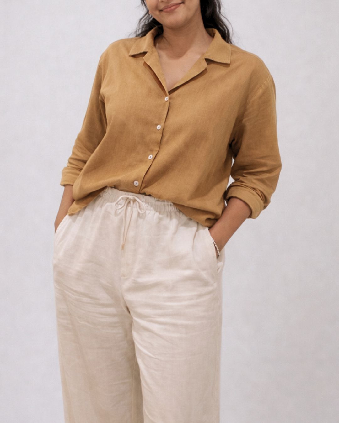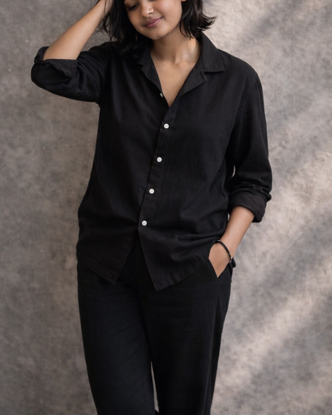 The open Cuban collar brings a sense of calm and openness, while the long sleeves and button-down structure keep the look grounded and versatile. It’s a piece made to move gently with the body — effortless, breathable, and quietly elegant.