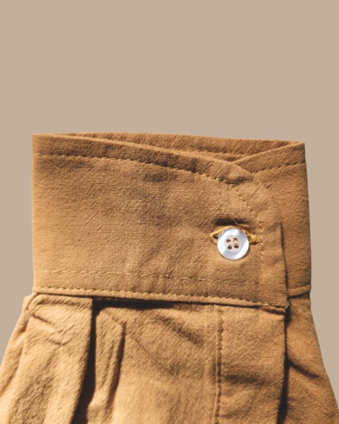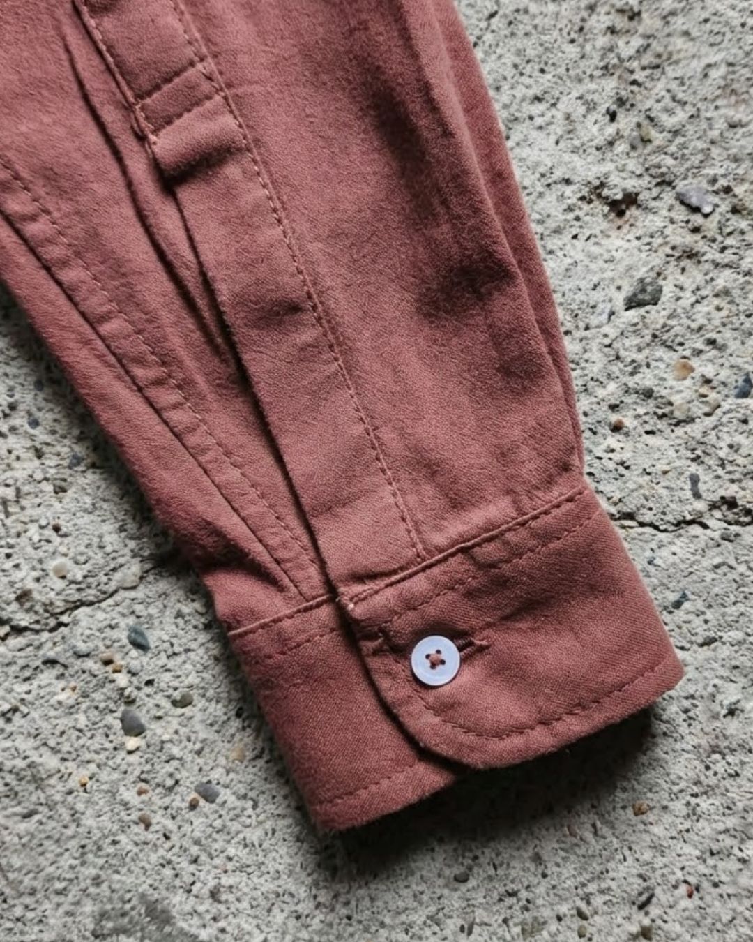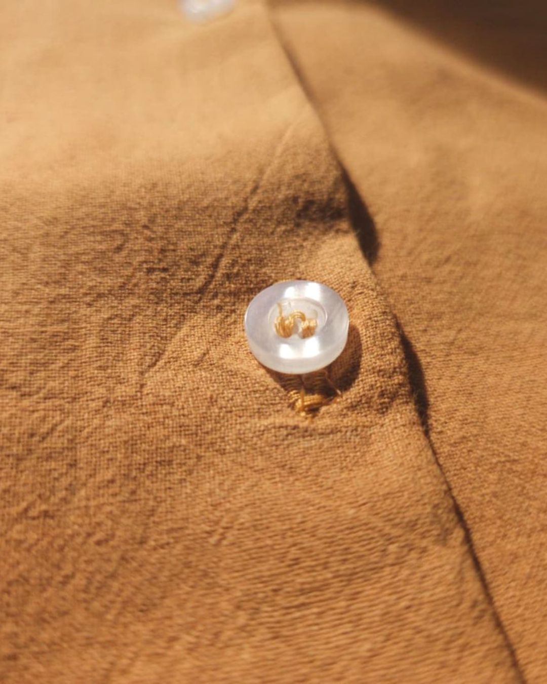 A full-length button placket runs down the front, finished with tonal or softly contrasting buttons chosen to complement each fabric and colourway. The detailing is quiet and intentional, allowing the fabric and silhouette to remain the focus.