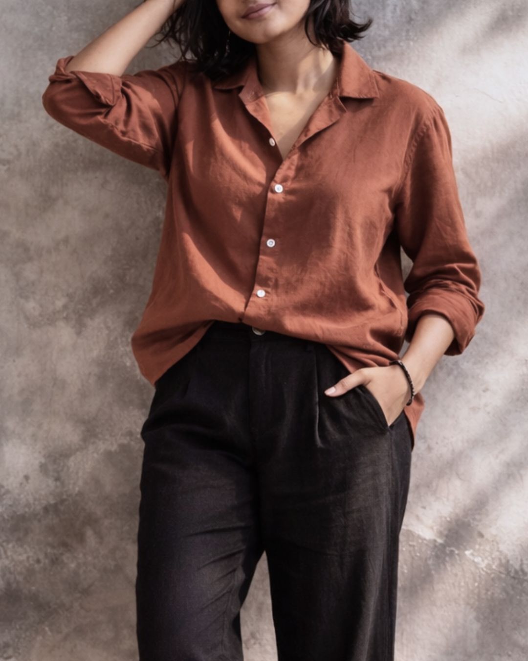 Button it up and style with cream, black, or earth-toned trousers. Let the silhouette speak while accessories stay minimal.