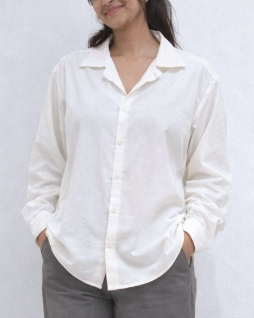 This is a shirt that feels relaxed but considered — oversized without being shapeless, feminine without being delicate.